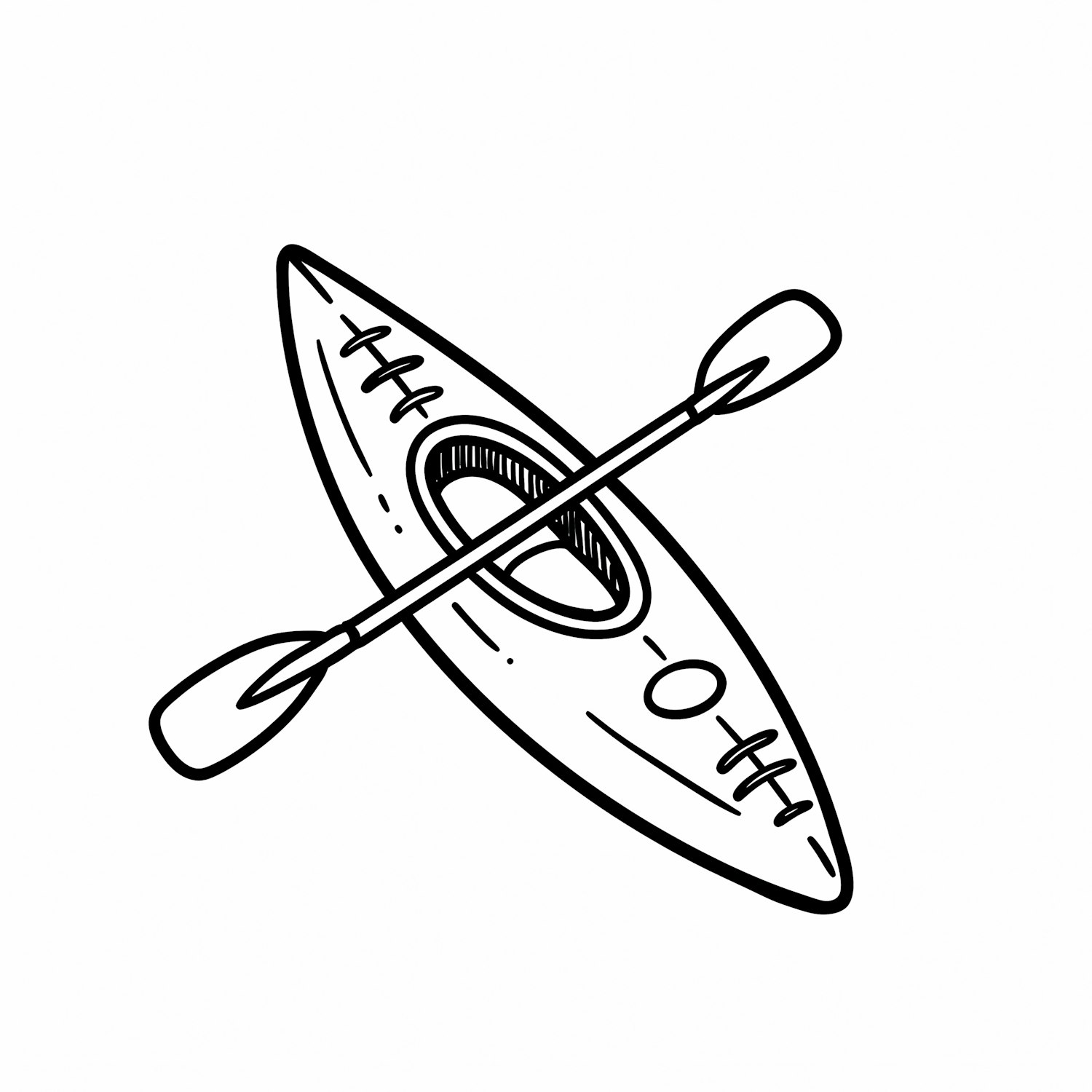 A clean black-and-white line drawing of a kayak with a paddle crossing over it, showcasing a simple and minimalistic design.