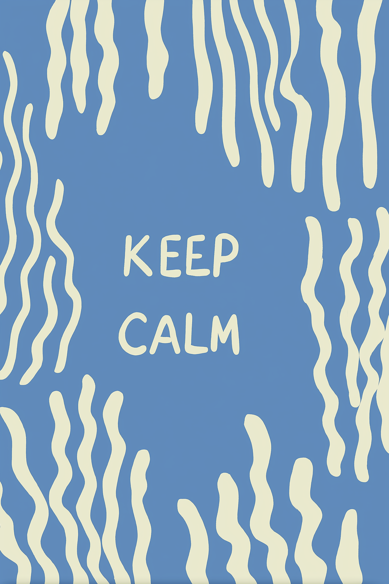 Minimalist 'KEEP CALM' design with cream wavy lines on a blue background, perfect for a calming and modern aesthetic.