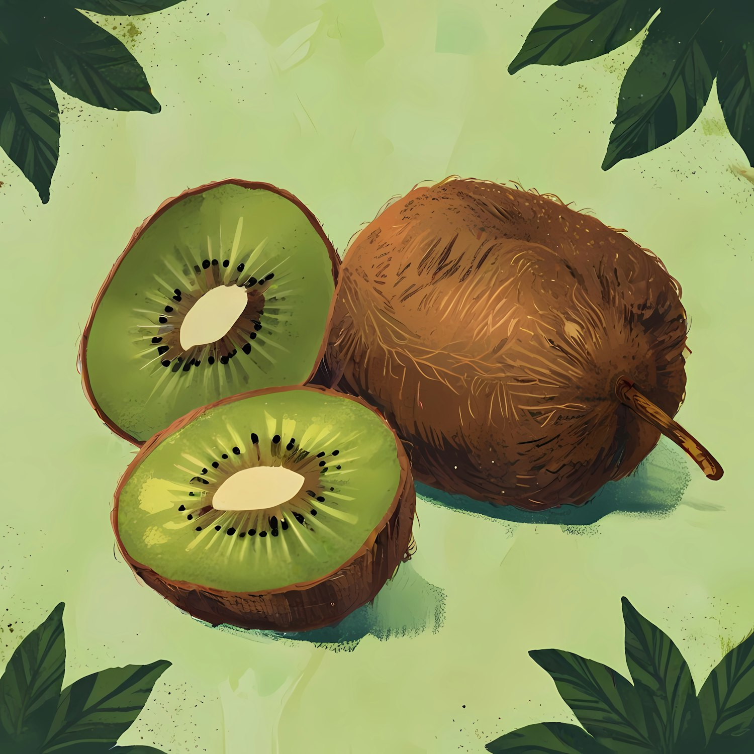 Illustration of a kiwi fruit with a detailed view of its fuzzy exterior and vibrant green interior, set against a leafy background.