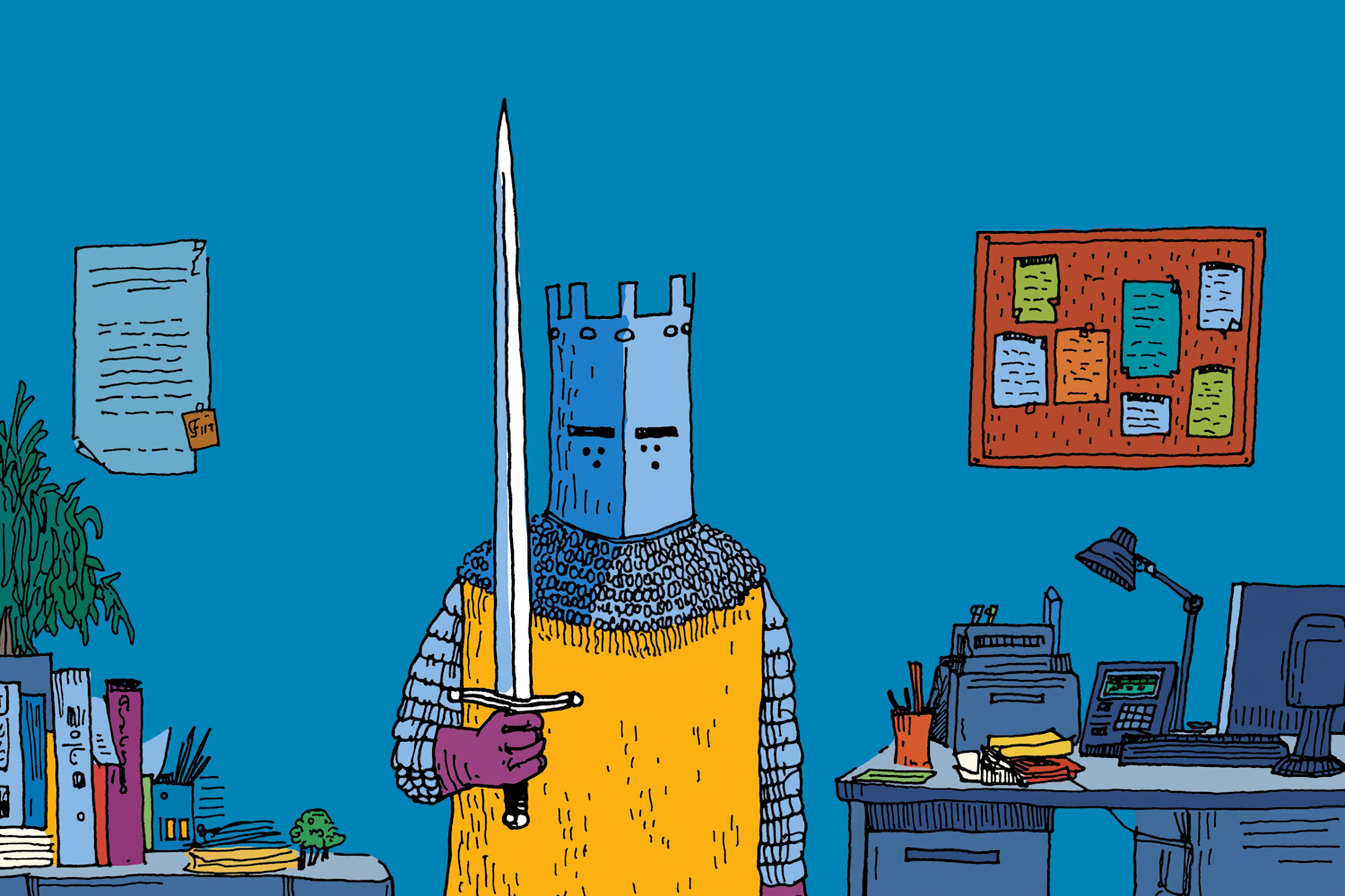 A knight in chainmail and a castle-like helmet stands in a modern office, holding a sword, blending medieval and contemporary elements.