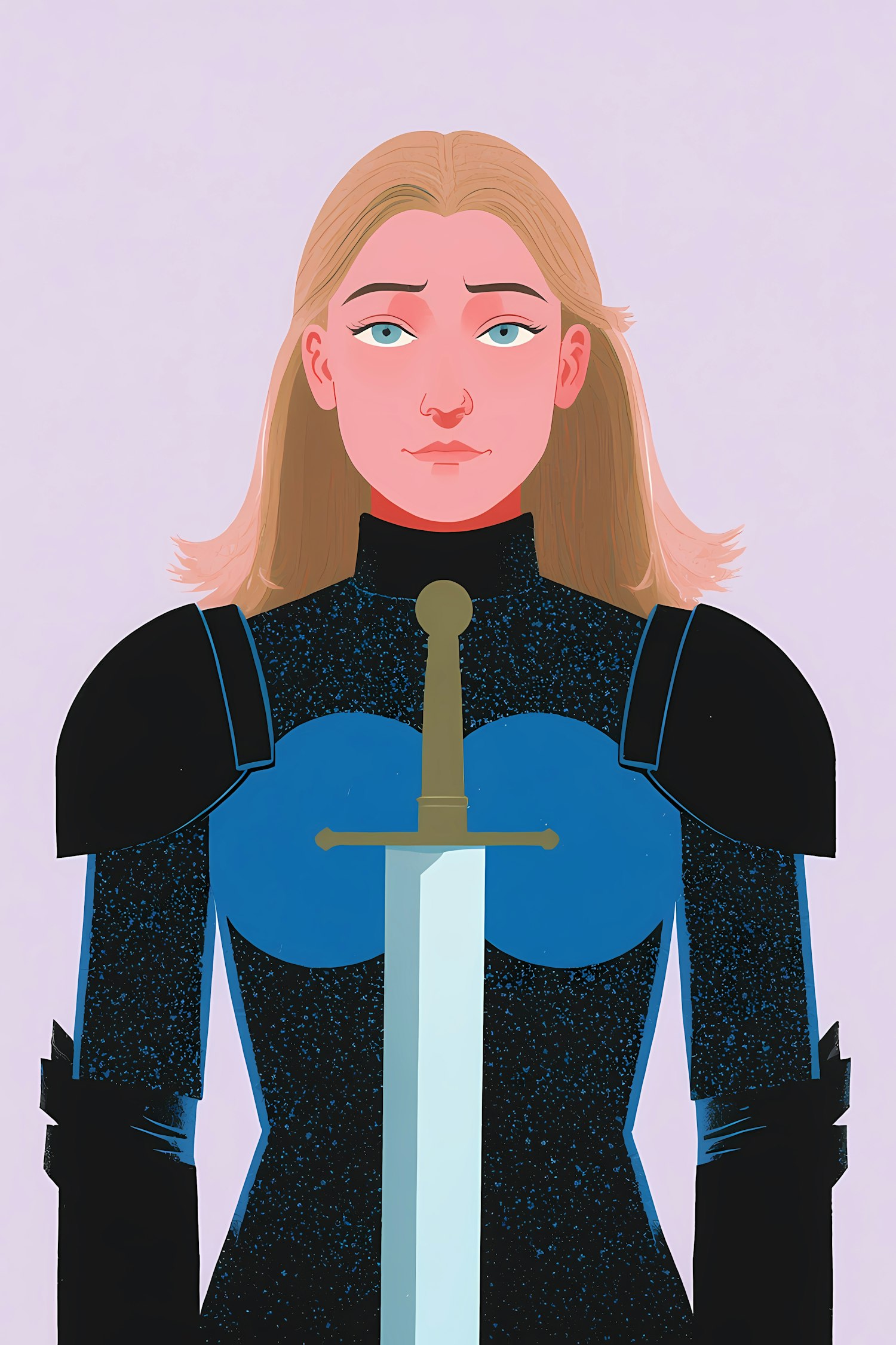 Stylized illustration of a blonde individual in dark armor holding a sword, set against a pastel purple background.