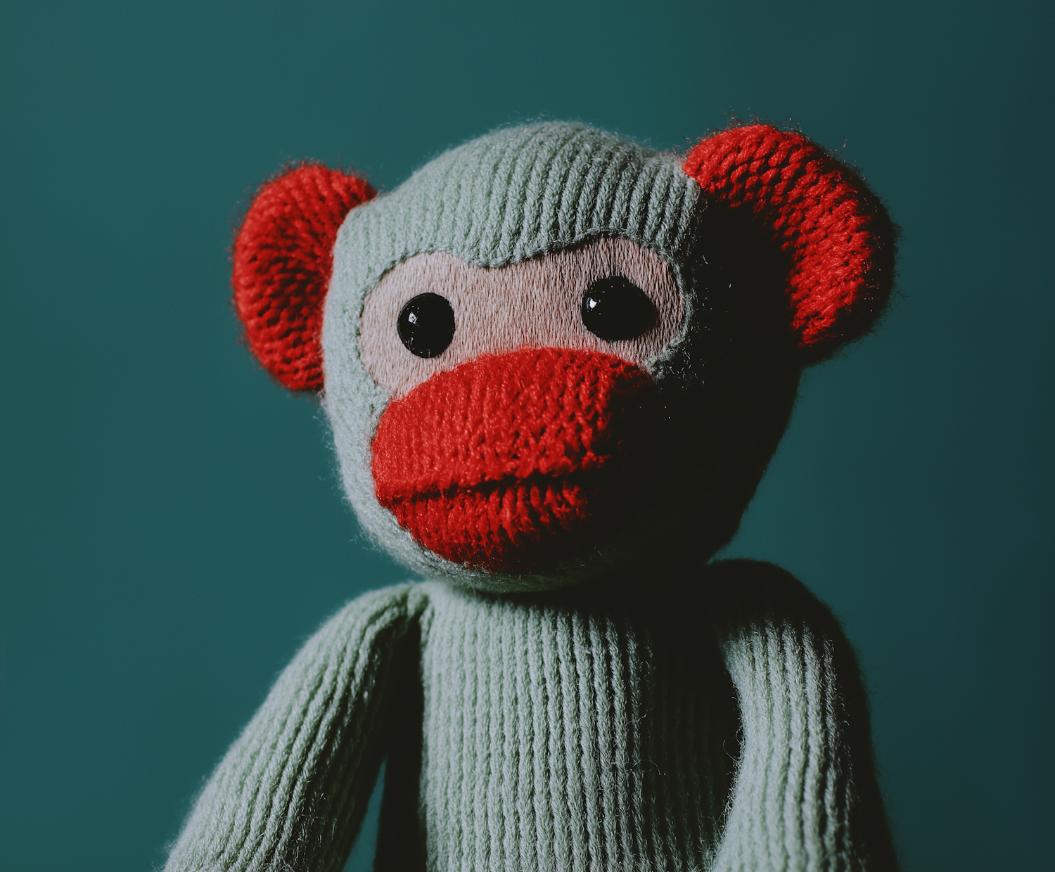 Close-up of a knitted sock monkey with red ears and mouth, button eyes, and a teal background. Cozy and handmade vibes.
