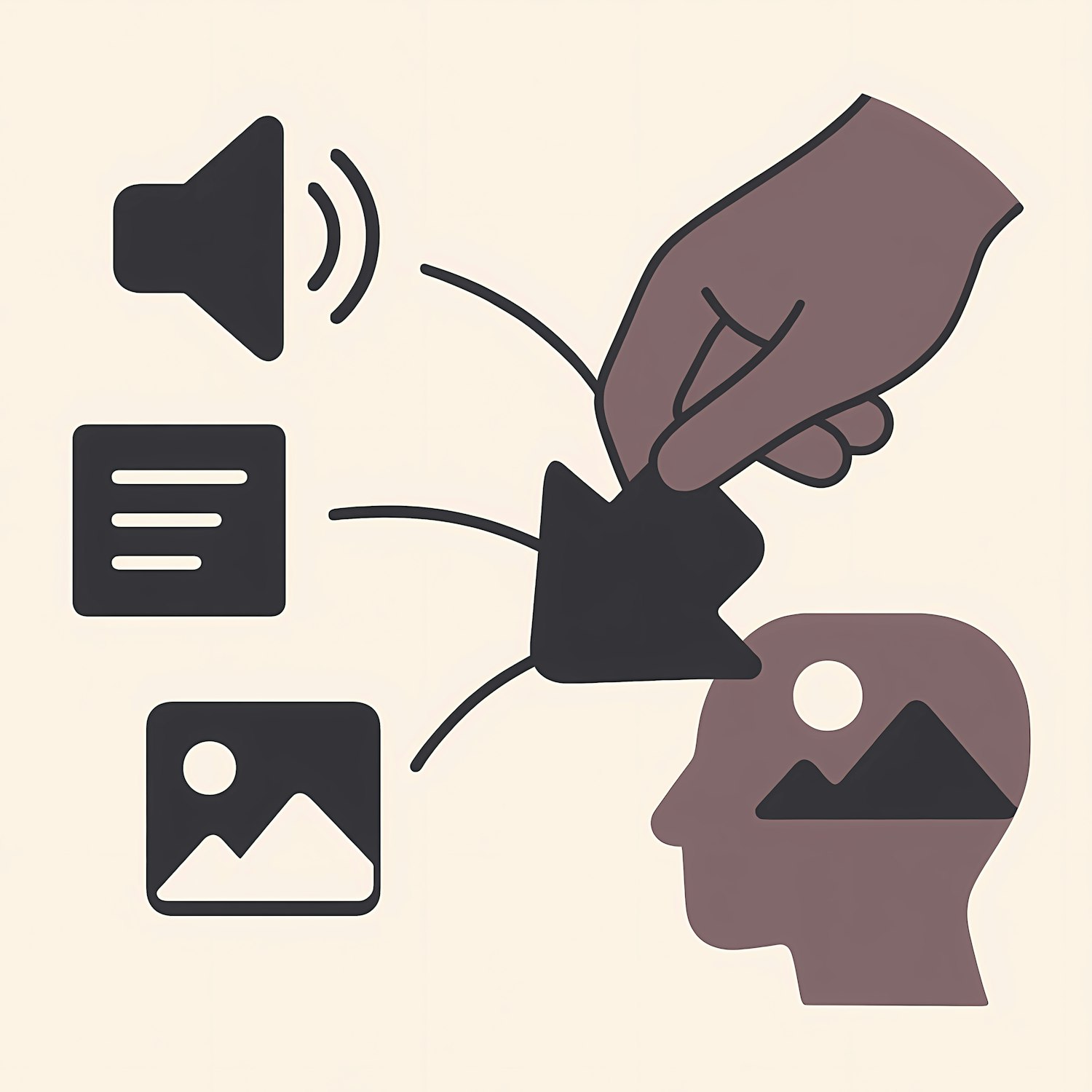 Minimalist illustration of a hand transferring sound, text, and image into a human head, symbolizing learning and information processing.
