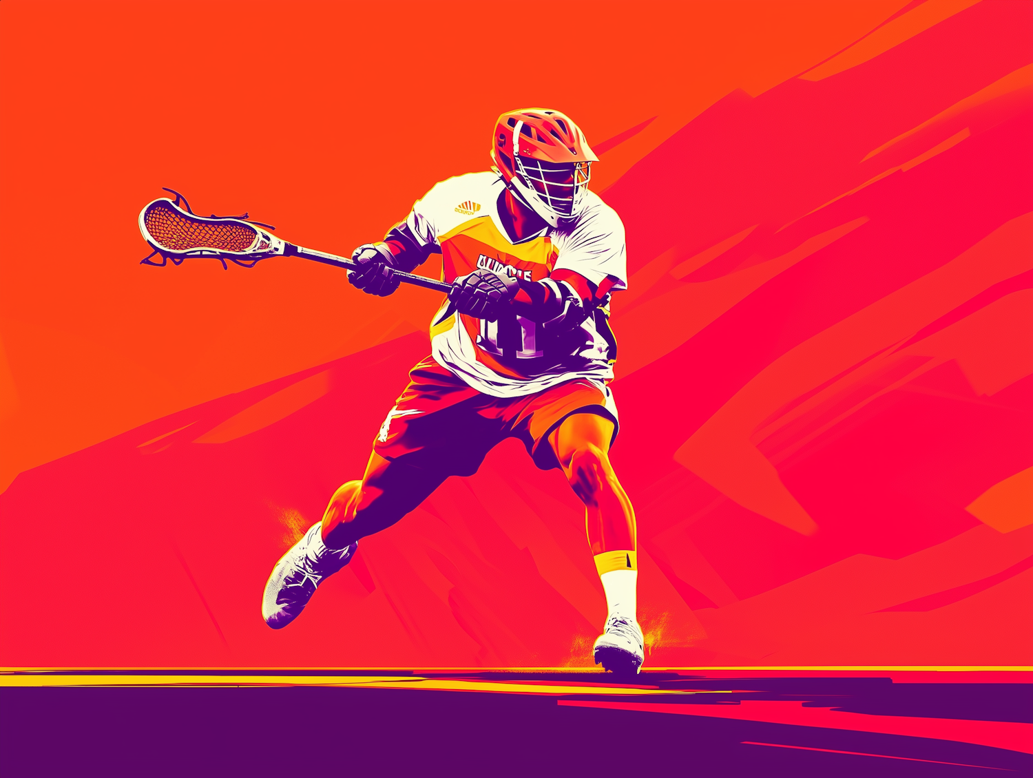Vivid illustration of a lacrosse player in action, set against a bold orange-red background, showcasing energy and athleticism.