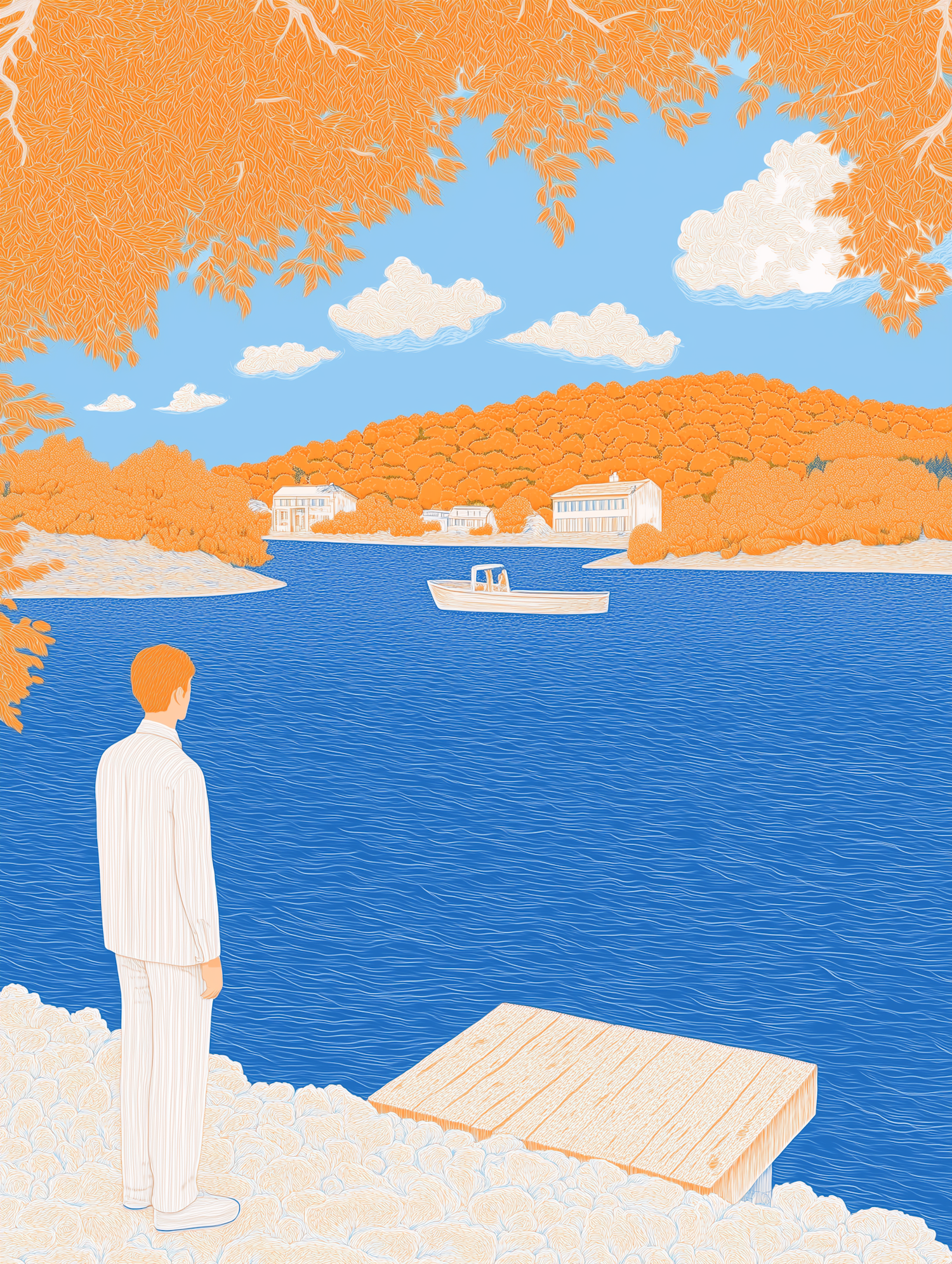 Illustration of a man in a white suit by a lake with orange foliage, a boat, and buildings in the background under a blue sky.