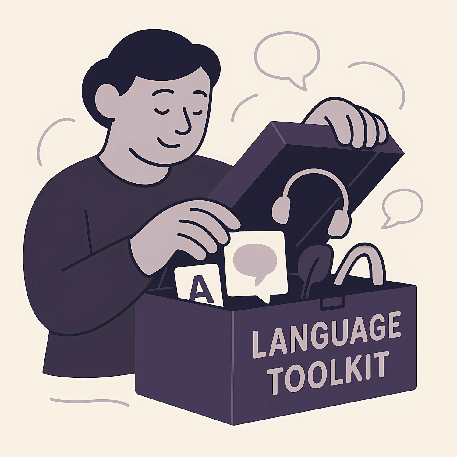 Illustration of a person opening a "Language Toolkit" box filled with communication symbols like speech bubbles and a headset.