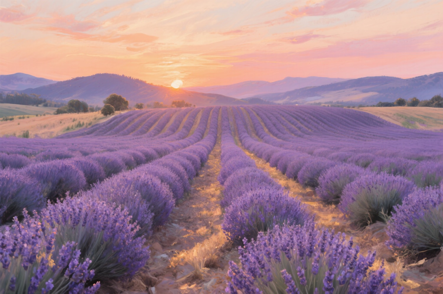 Lavender fields in Provence at sunset, rows of purple stretching to the horizon, impressionist oil painting style.