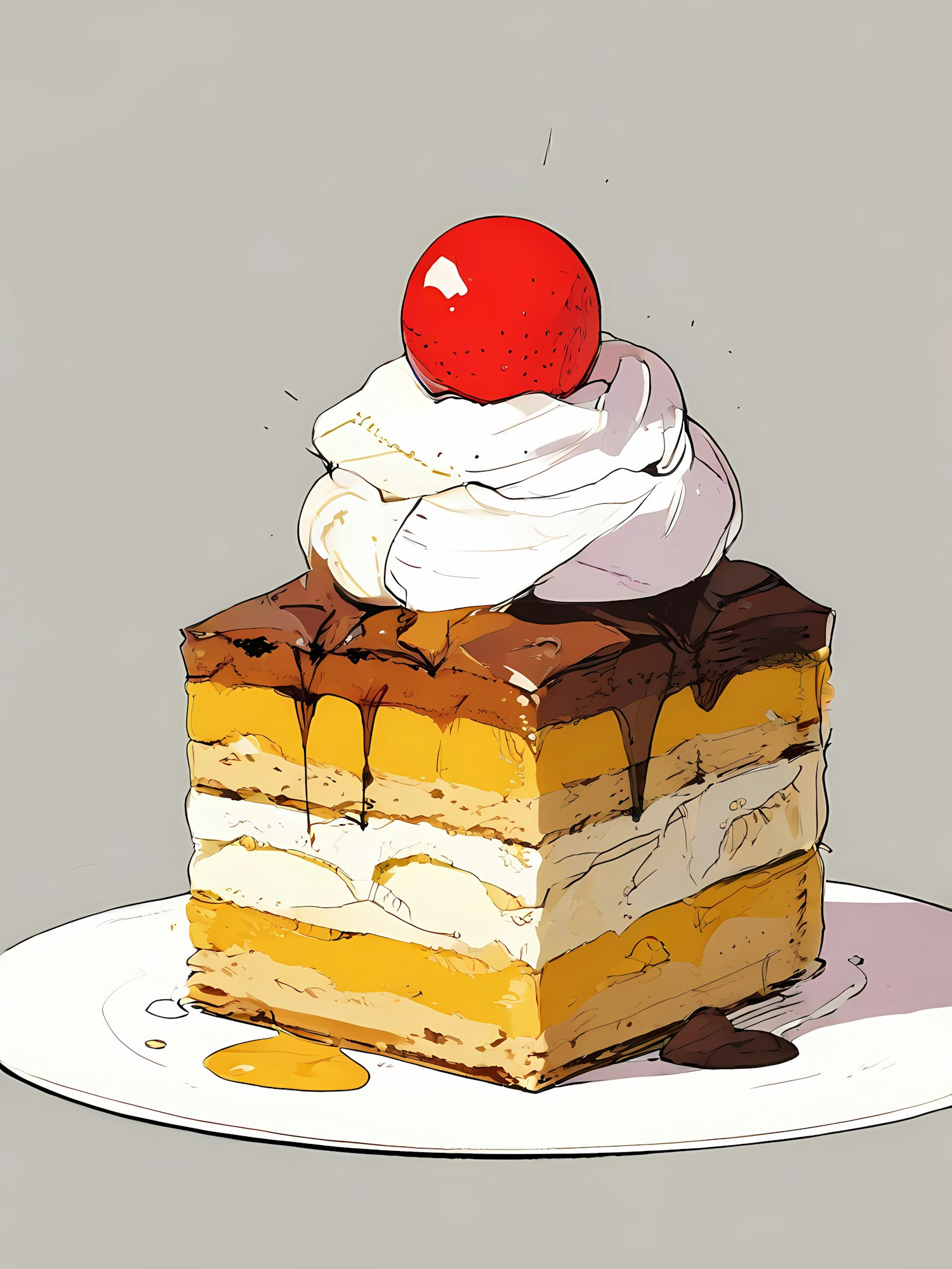 Illustration of a layered dessert with sponge cake, whipped cream, chocolate, and a cherry on top, served on a white plate.
