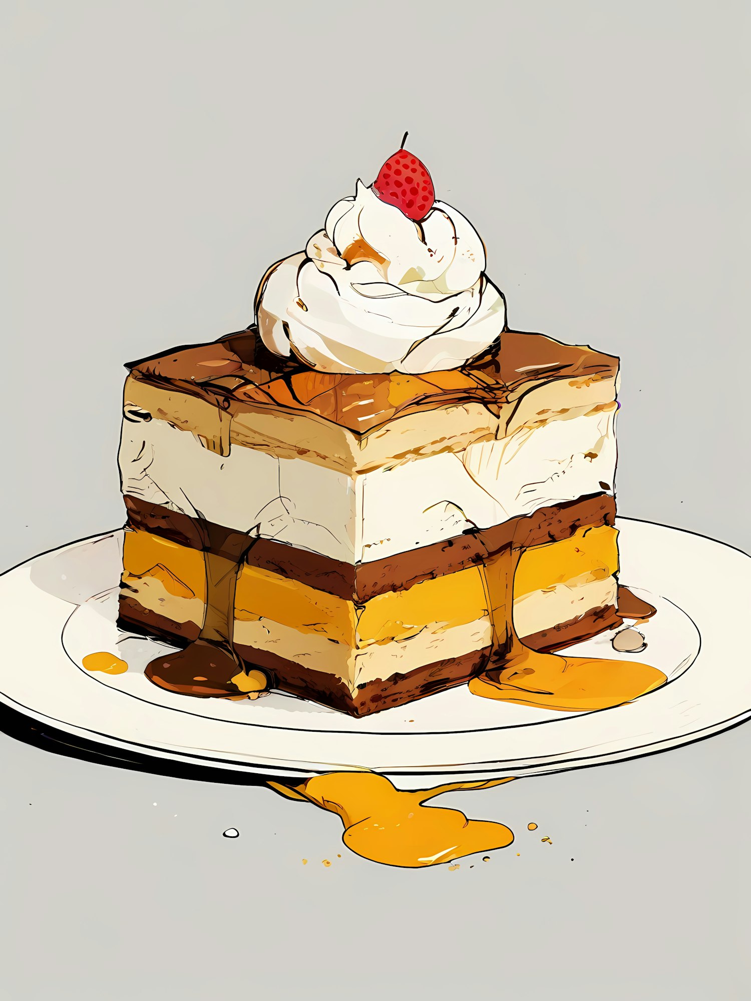 Illustration of a layered cake slice with whipped cream, strawberry, and caramel sauce on a white plate. Perfect for dessert lovers.