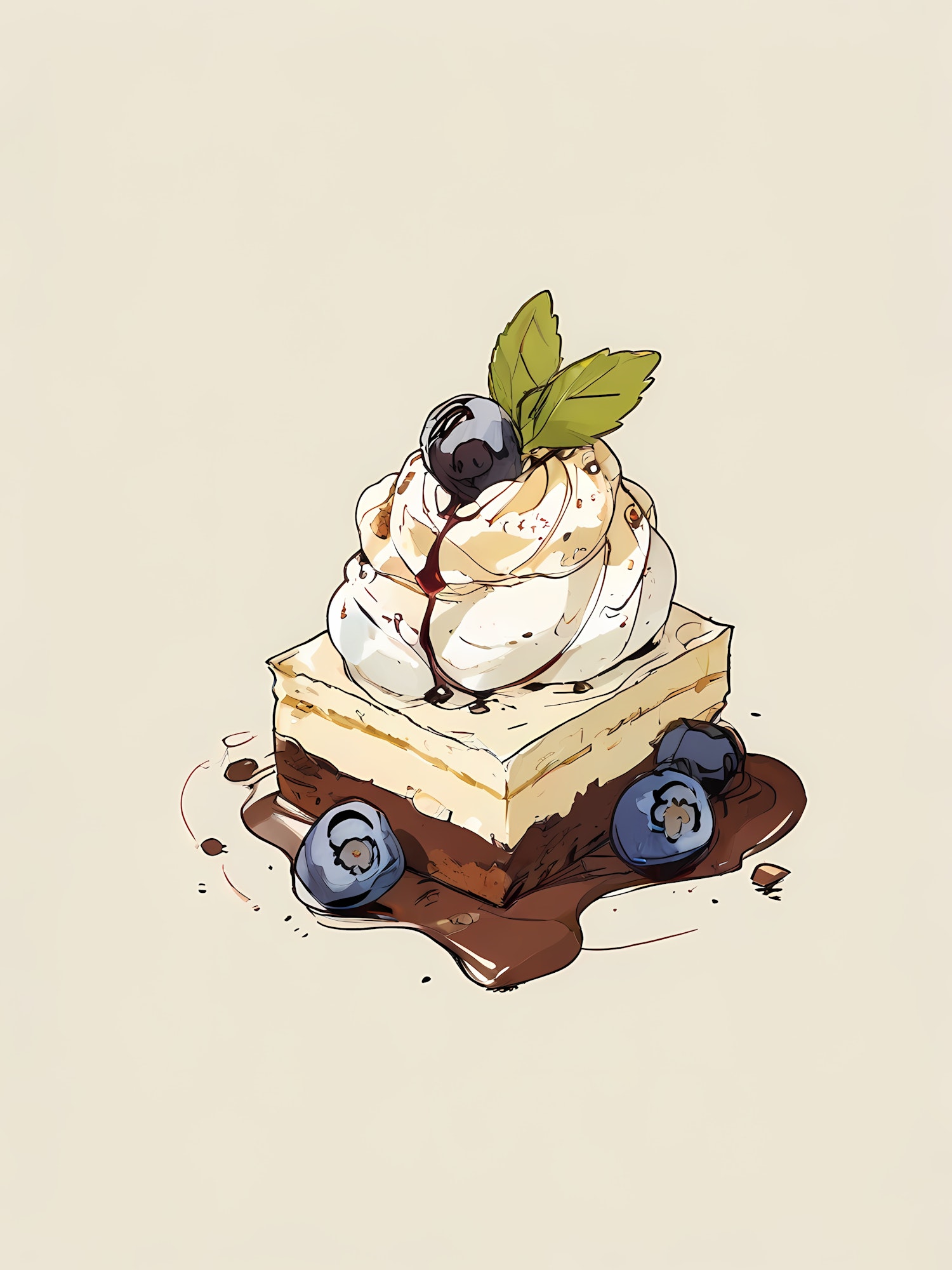 Illustration of a layered cake with whipped cream, chocolate drizzle, blueberries, and mint on a beige background.