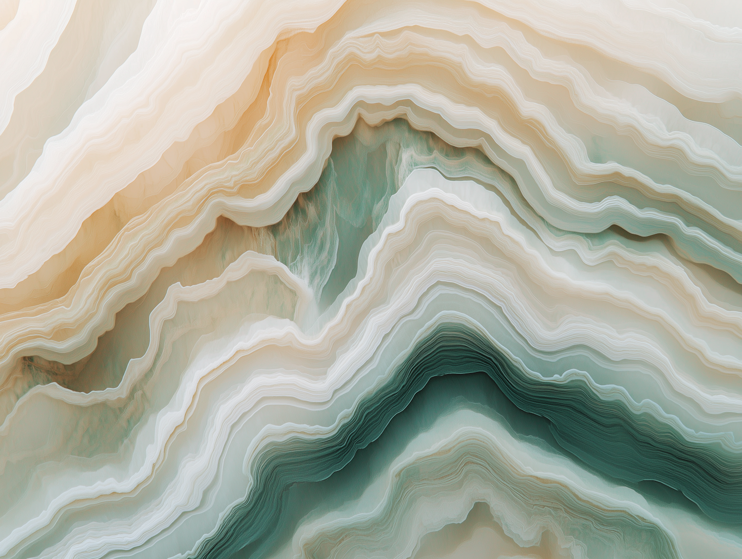 Abstract layered design with soft beige, cream, and green tones, resembling geological strata or mineral formations. Smooth and organic flow.