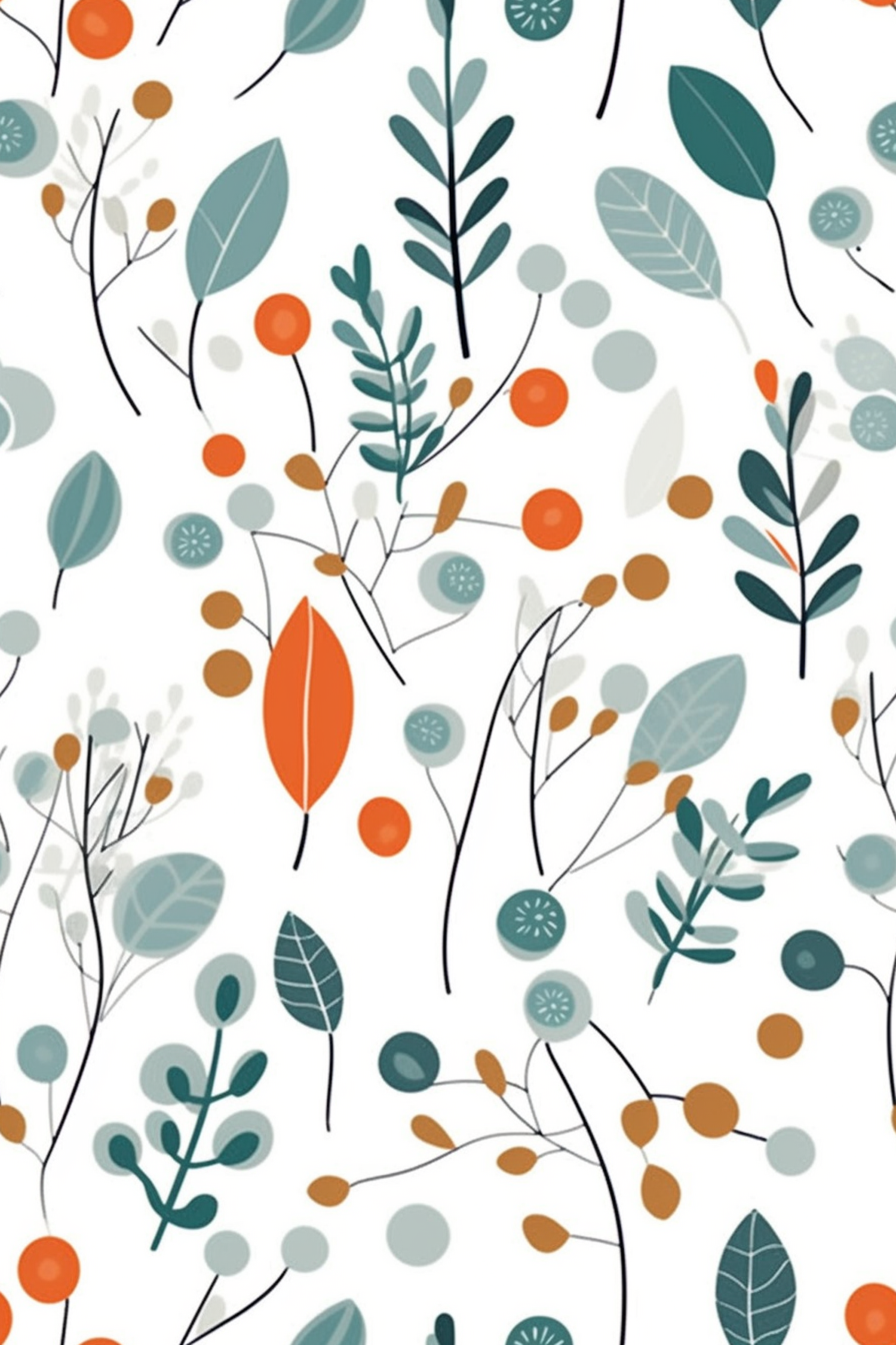 Stylized leaf and berry pattern with green, teal, and orange hues on a white background, creating a fresh and modern design.