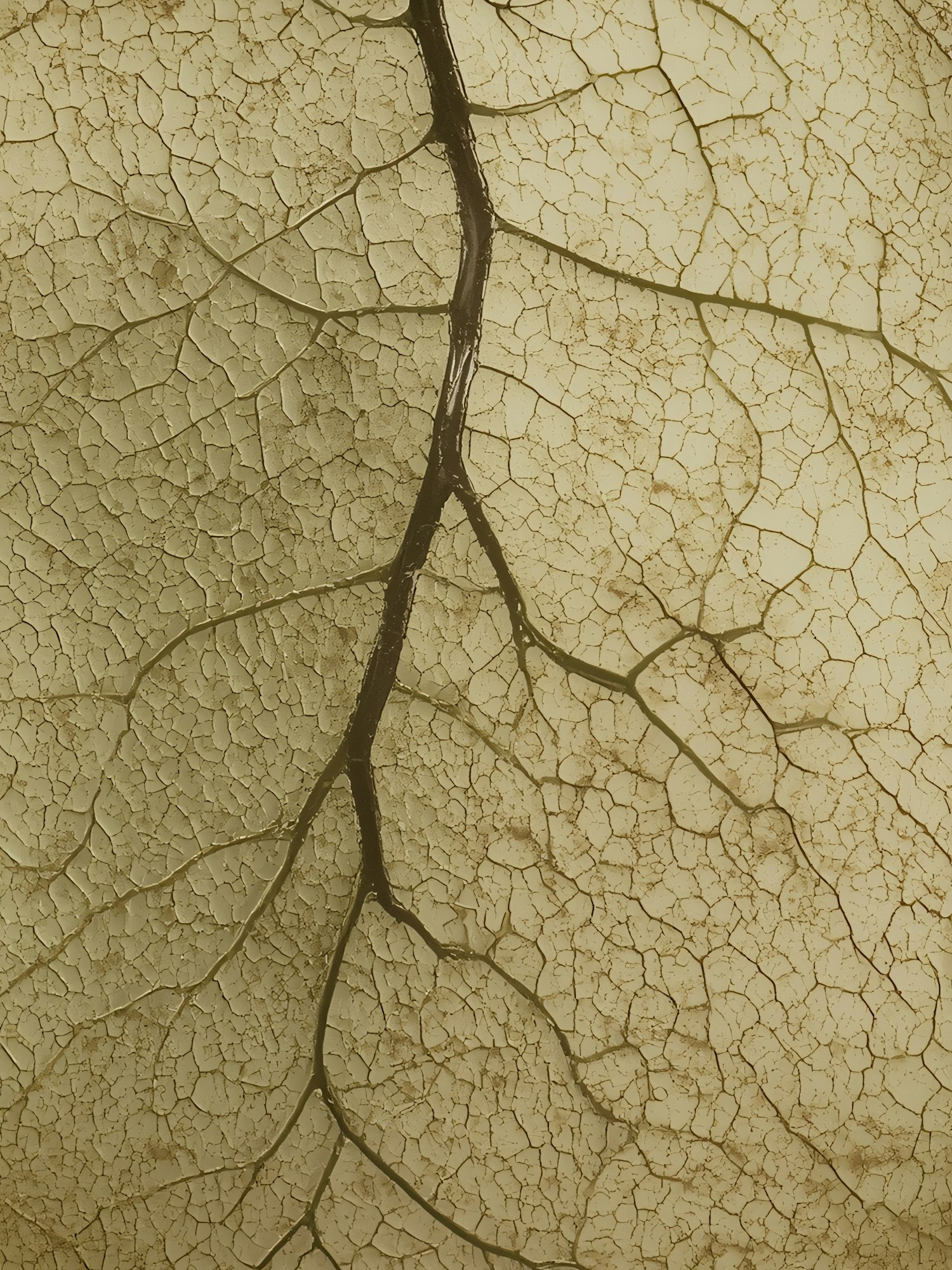 Close-up of a leaf's vein structure, showcasing intricate patterns and textures in earthy tones, emphasizing natural beauty and detail.