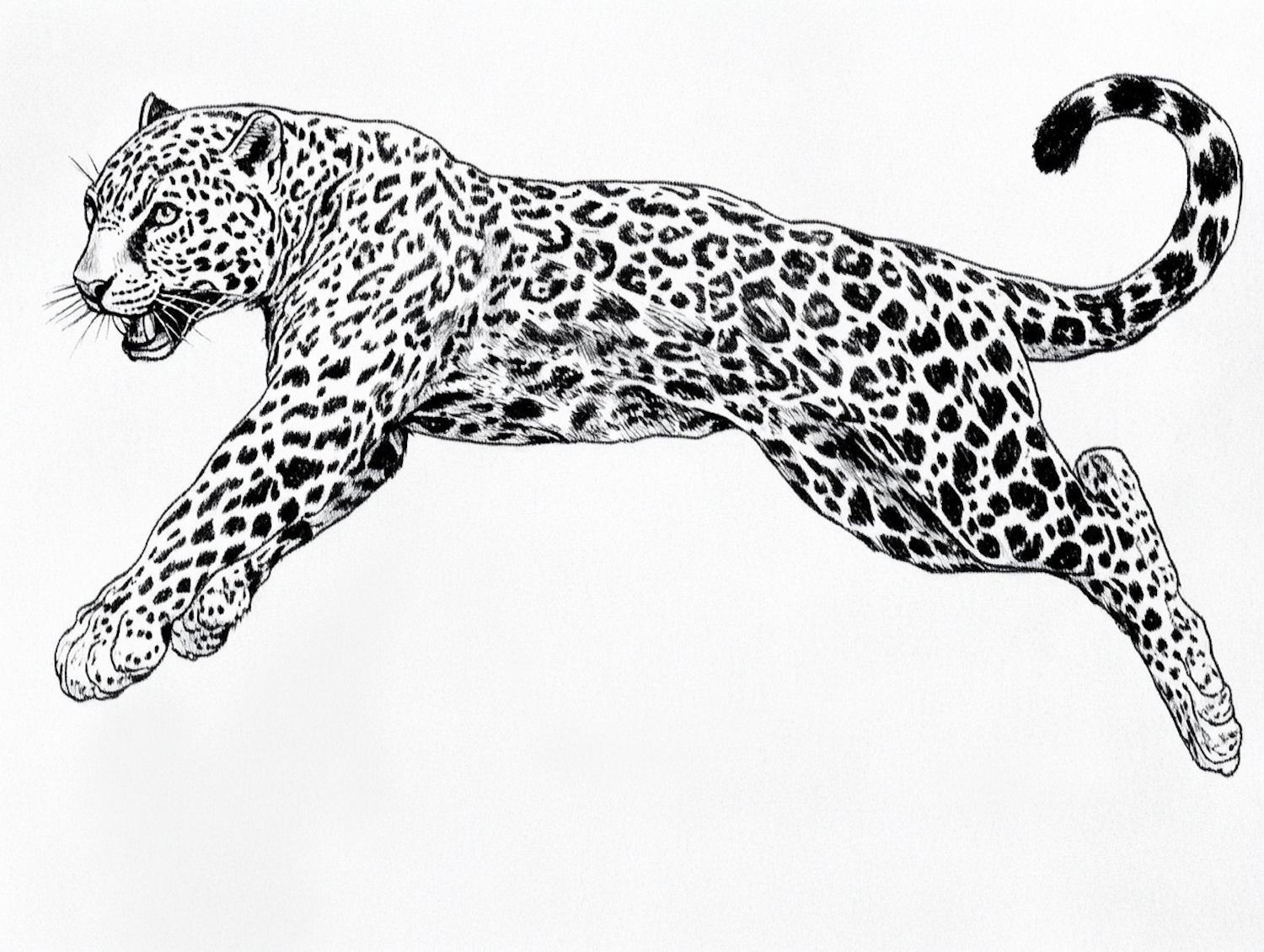 Dynamic black-and-white illustration of a leaping leopard, showcasing its detailed spots, muscular build, and expressive face.