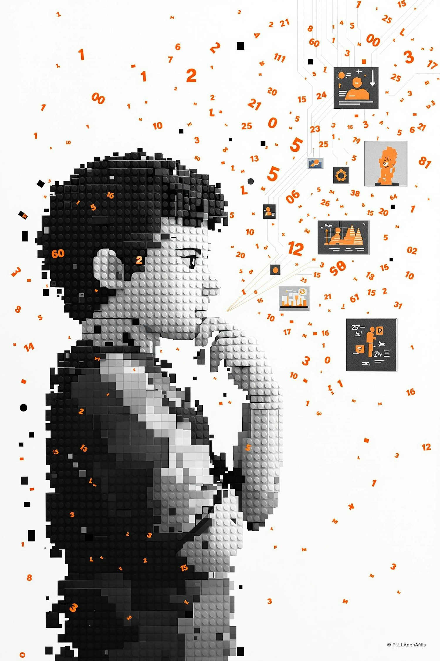 A LEGO-style grayscale figure in a thinking pose surrounded by orange numbers and data icons, symbolizing analytics and technology.