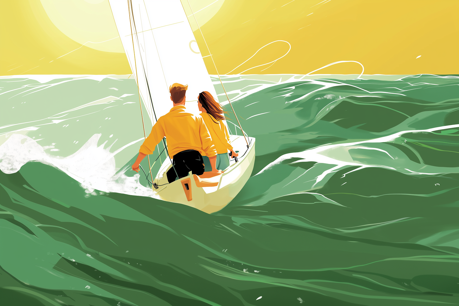 Illustration of a couple sailing on a small boat in vibrant green waves under a golden sky, evoking adventure and freedom.