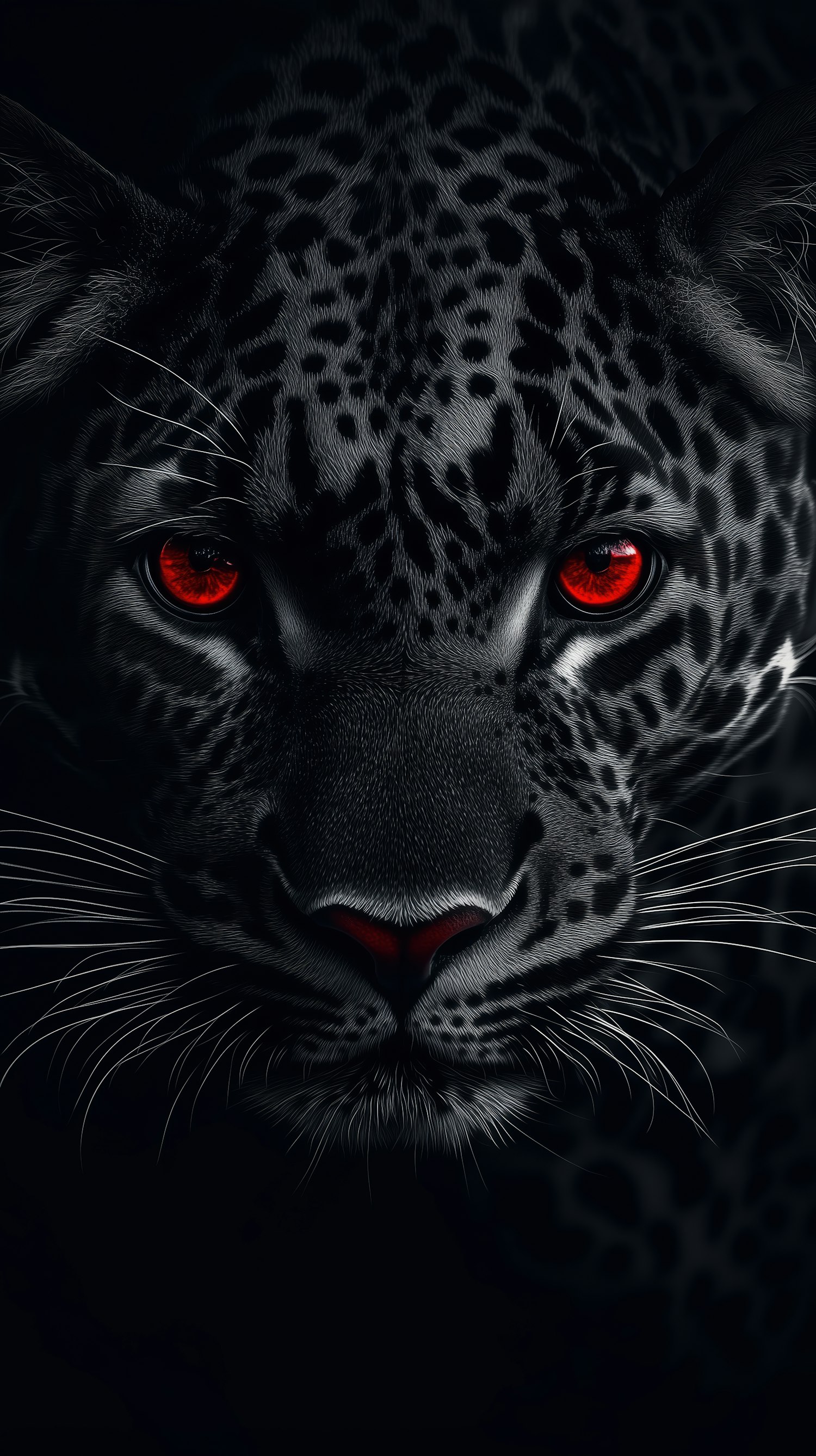 Close-up of a leopard with intense red eyes and detailed black fur, creating a mysterious and captivating visual.