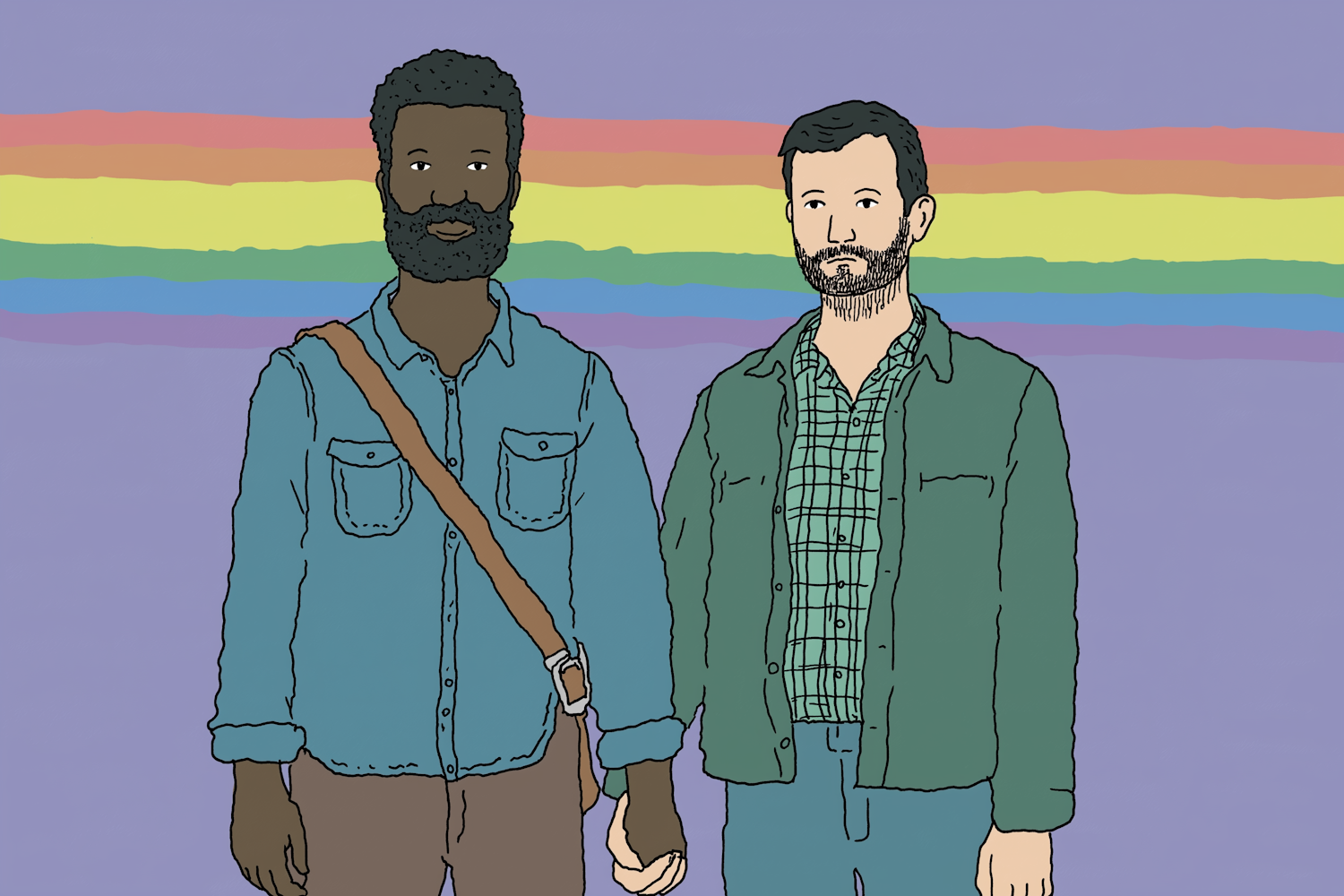 Illustration of two men holding hands with a rainbow pride flag background, symbolizing LGBTQ+ love and unity.