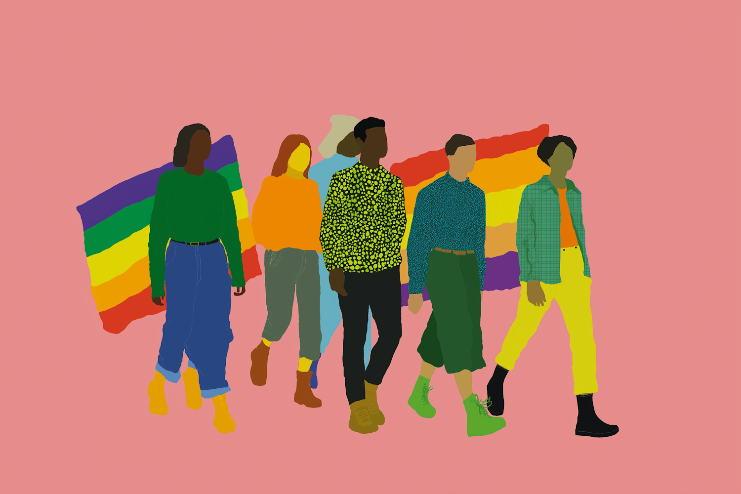 Illustration of diverse individuals walking with rainbow flags, symbolizing LGBTQ+ pride and unity, set against a bold pink background.