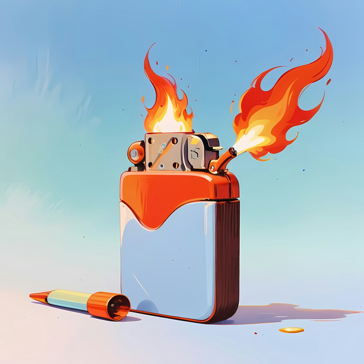 A bold illustration of a red and white lighter with dynamic flames, paired with a colorful pen on a soft blue background.
