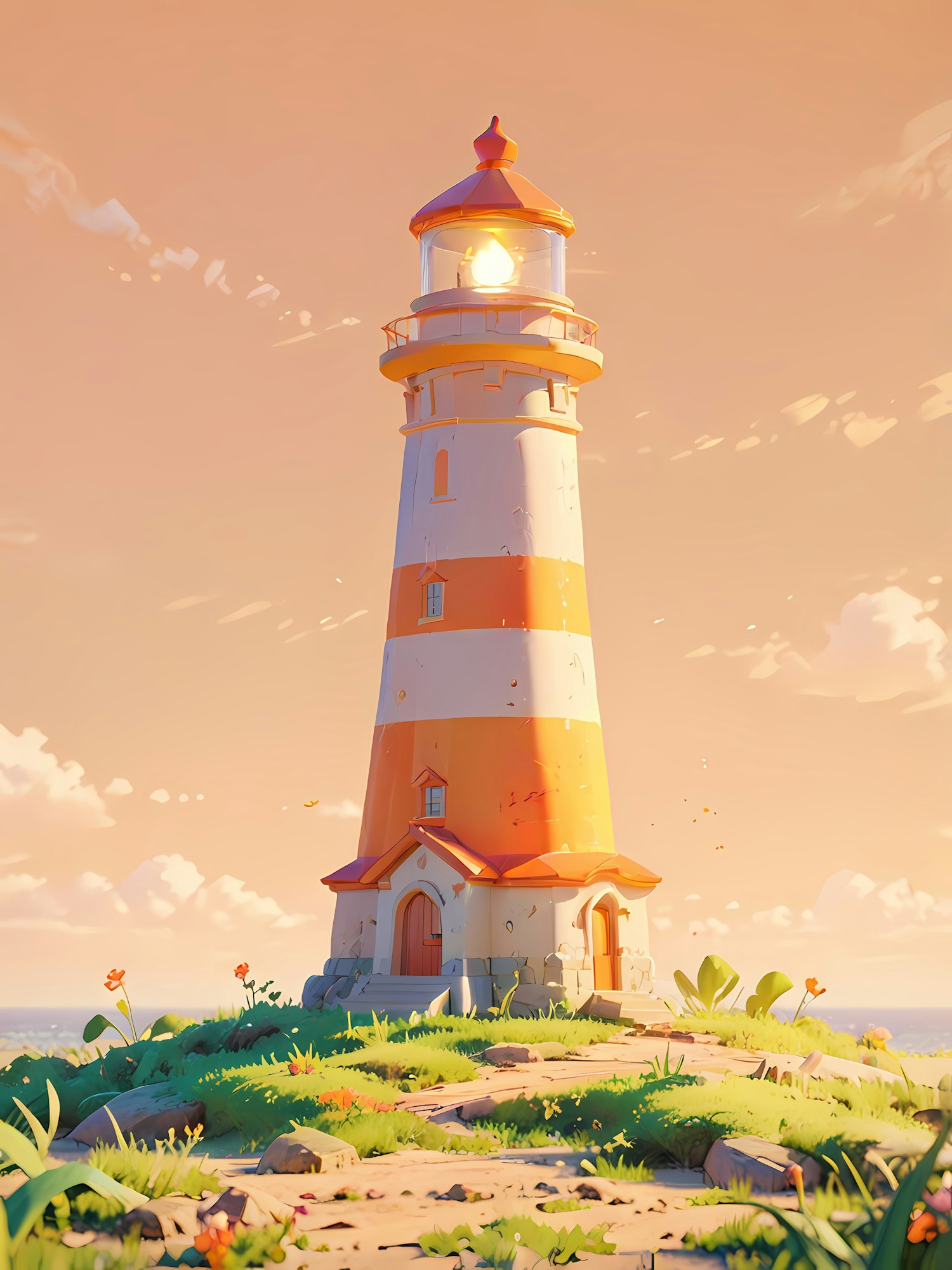 A charming lighthouse with orange and white stripes glows warmly in a serene coastal setting with lush greenery and a golden sky.