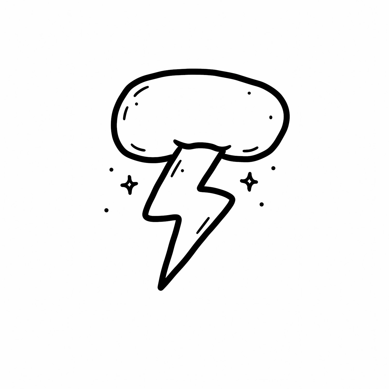 Cartoon-style black-and-white illustration of a lightning bolt emerging from a cloud with sparkles around it.