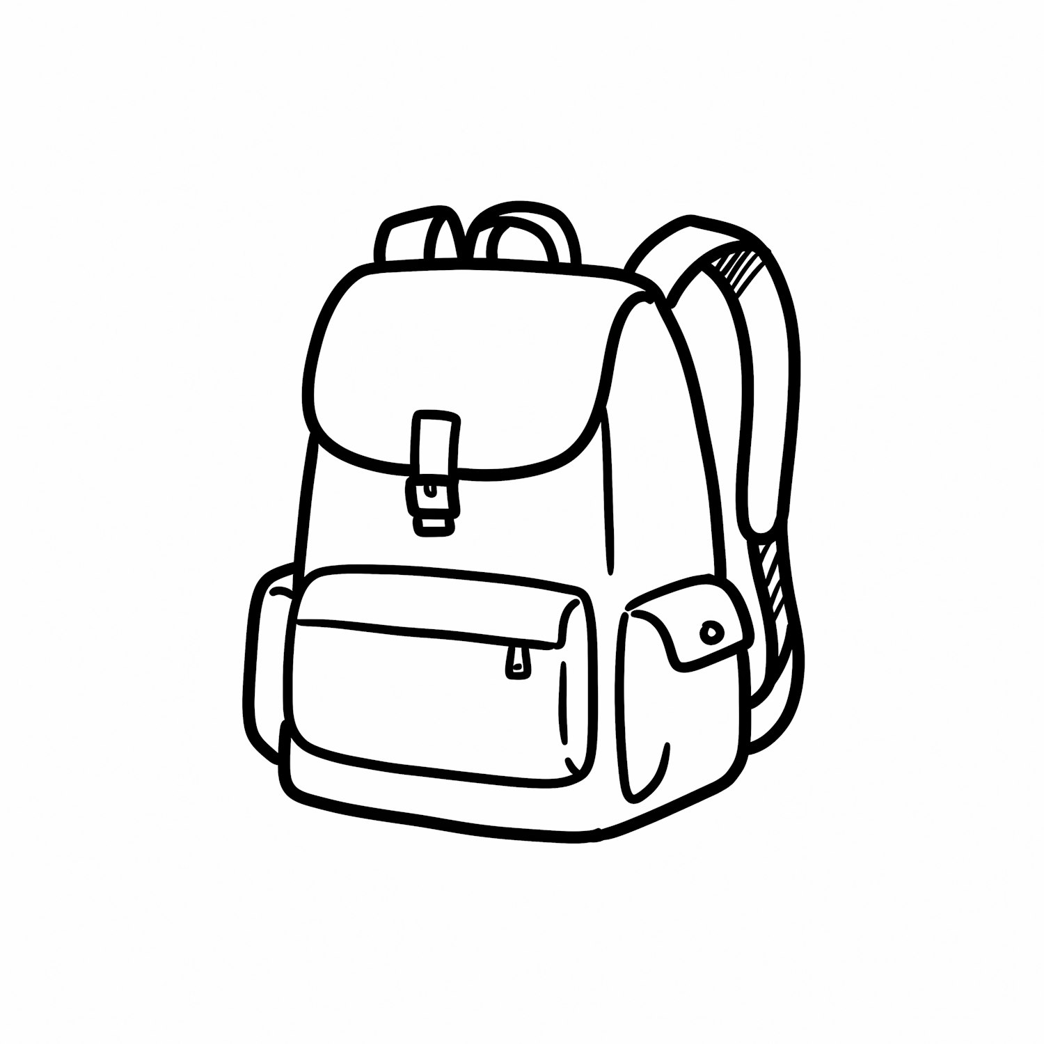 A clean black-and-white line drawing of a backpack with a flap, buckle, and multiple compartments, showcasing a practical design.