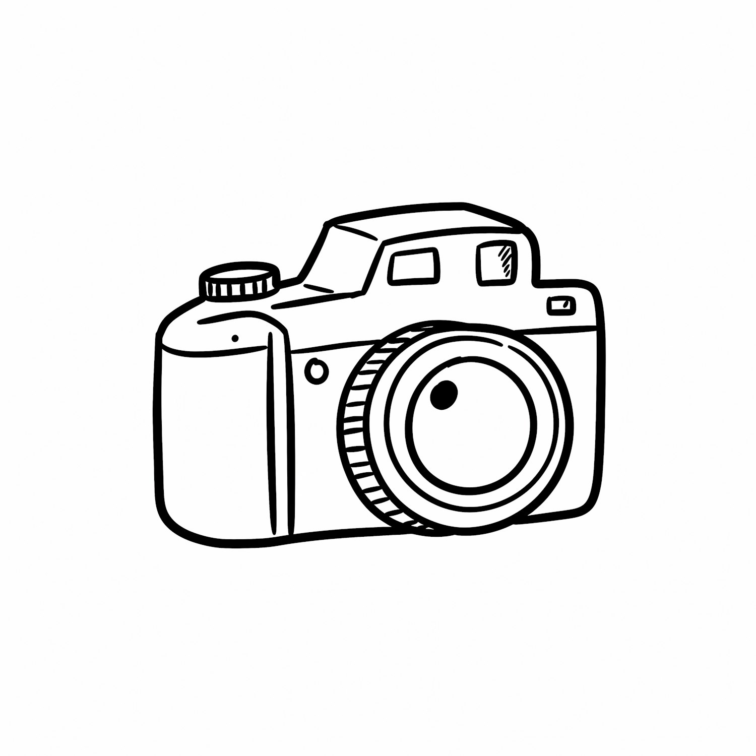 Minimalistic black-and-white line drawing of a camera, showcasing its lens, viewfinder, and body details in a clean and bold style.