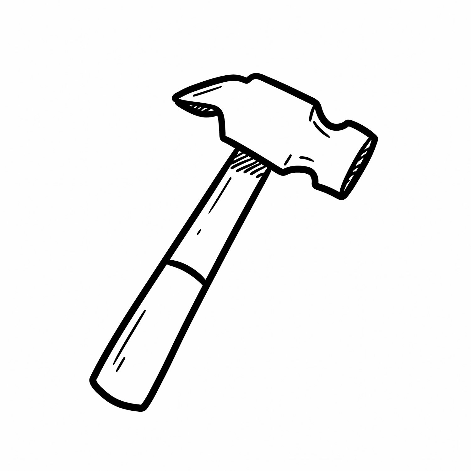 A clean black-and-white line drawing of a hammer with a wooden handle and a metal head, perfect for design or educational use.