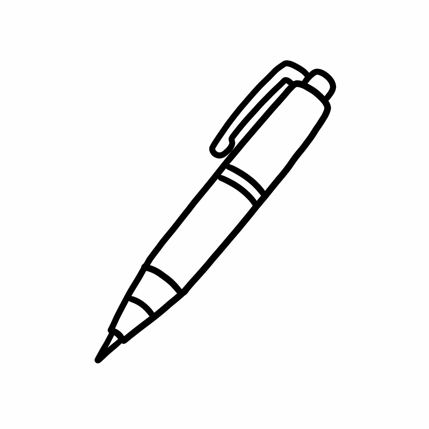 Minimalist black-and-white line drawing of a pen with a clip and pointed tip, perfect for design or educational purposes.