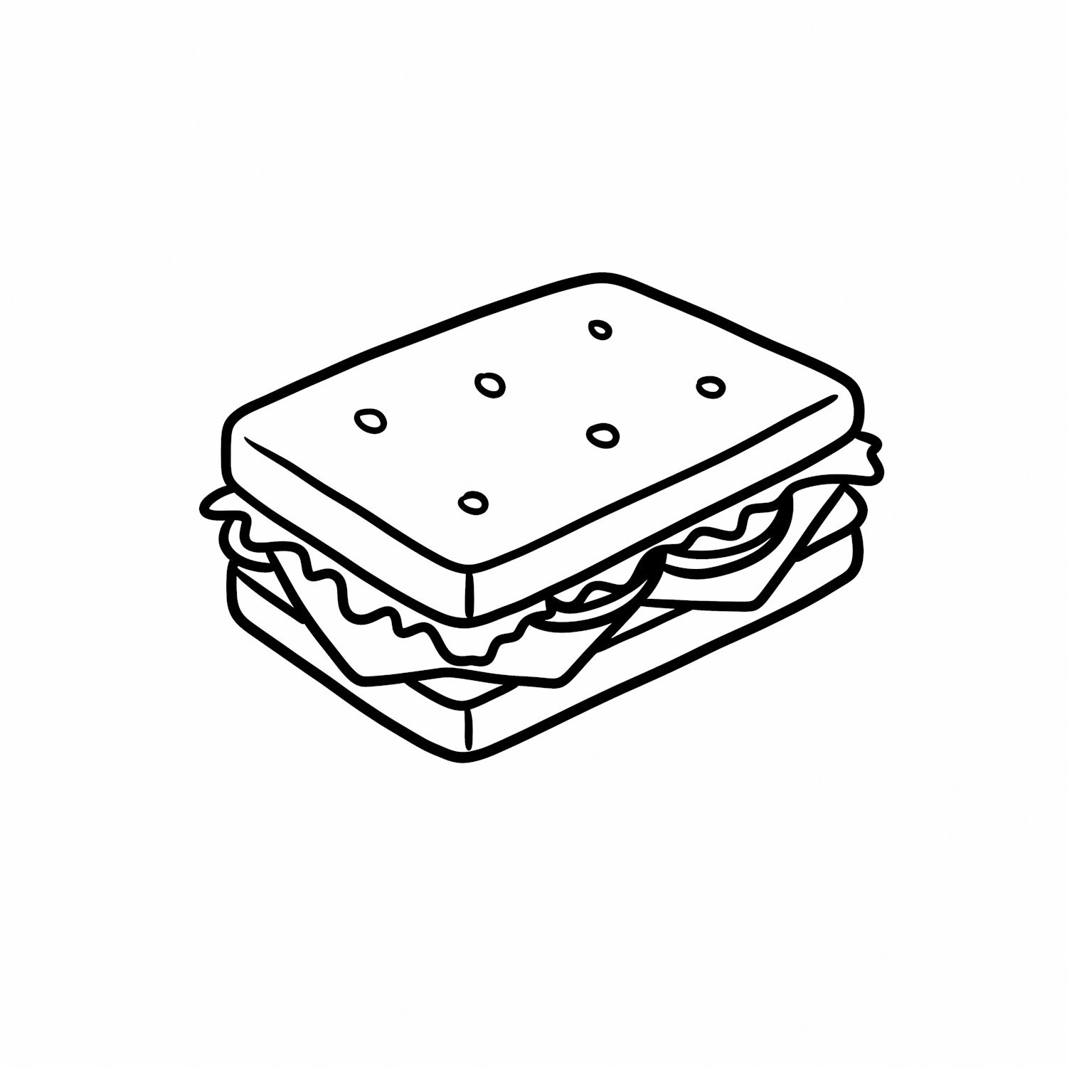 A clean black-and-white line drawing of a sandwich with lettuce and tomato, perfect for coloring or design projects.