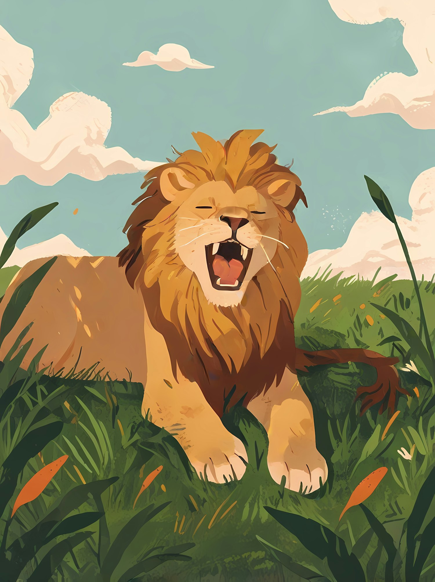 Illustration of a majestic lion yawning in a grassy field under a bright blue sky with fluffy clouds. Vibrant and serene artwork.