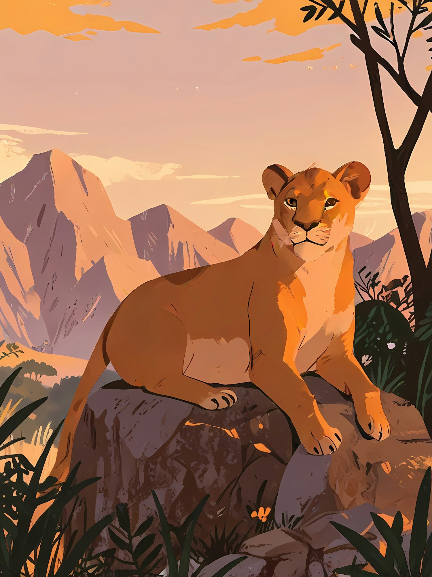 A majestic lioness rests on a rock, surrounded by lush greenery and a stunning mountain sunset in this vibrant illustration.