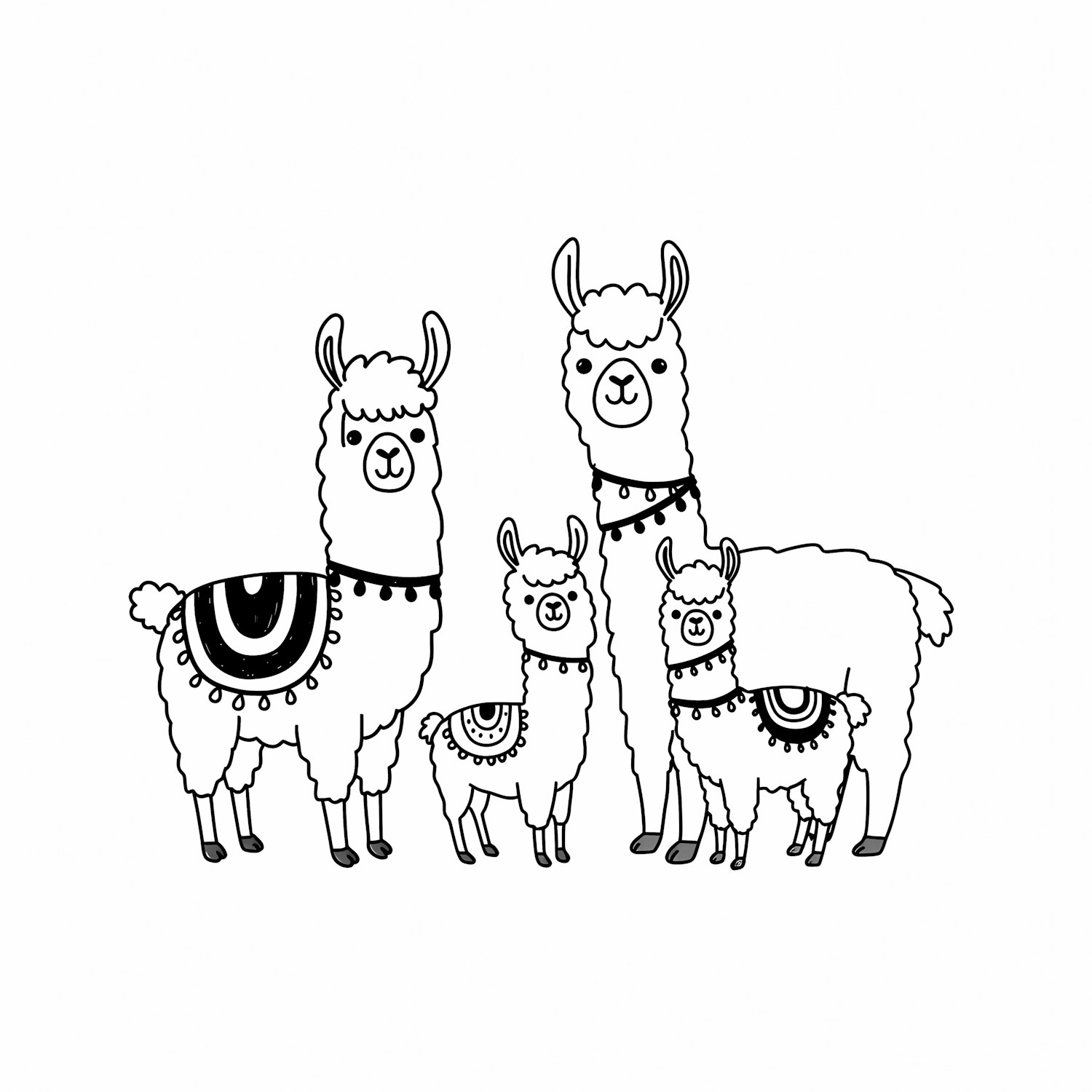 A charming black-and-white illustration of a llama family with decorative blankets and necklaces, perfect for coloring or design inspiration.