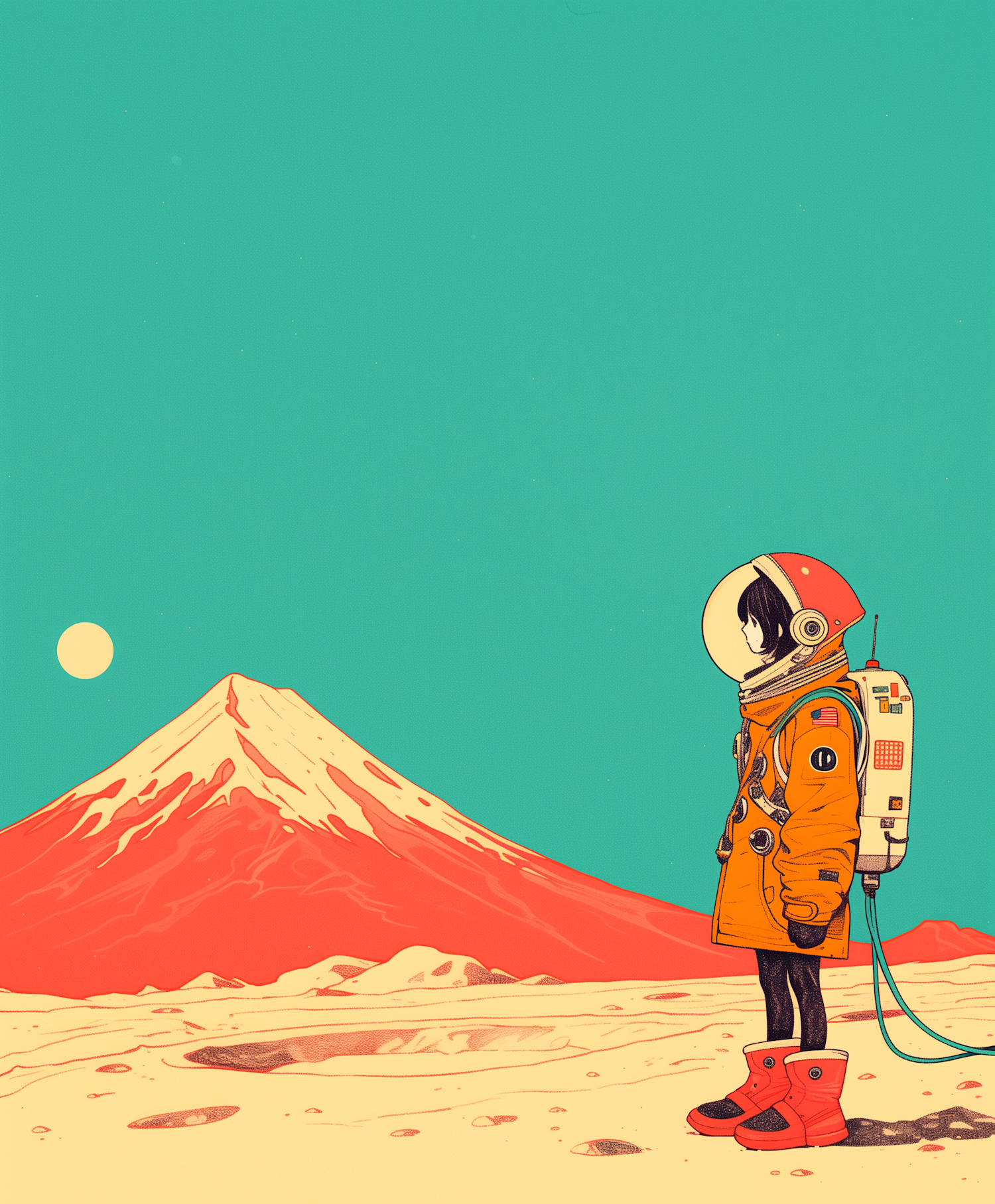Stylized illustration of an astronaut in an orange suit on an alien landscape with a turquoise sky and distant mountain.