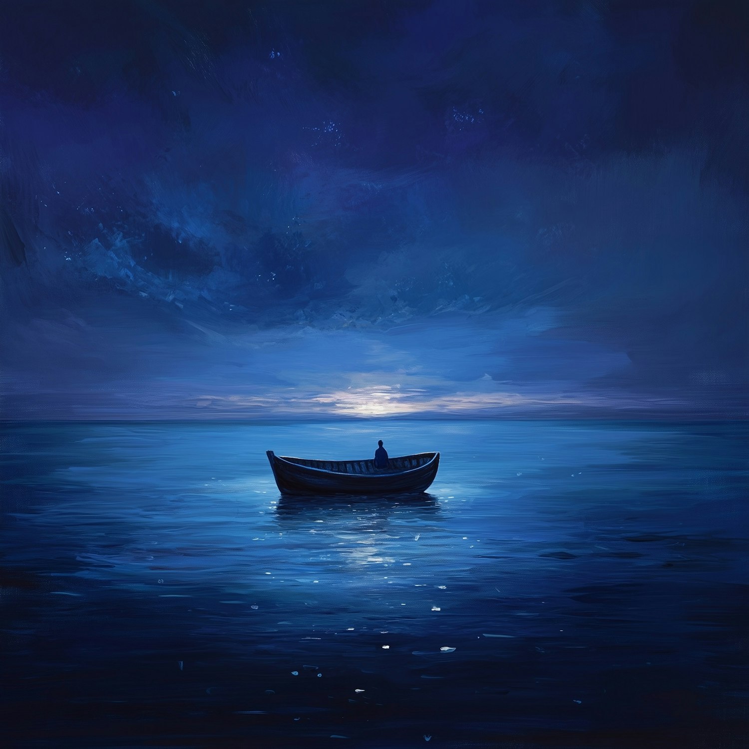 A tranquil illustration of a lone boat on a calm ocean under a deep blue night sky, with a soft glow on the horizon.