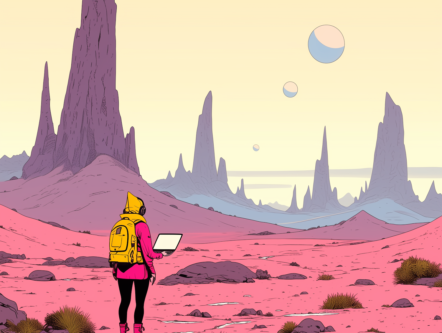 A lone traveler in a yellow jacket explores a surreal pink landscape with towering rock formations and floating spheres.