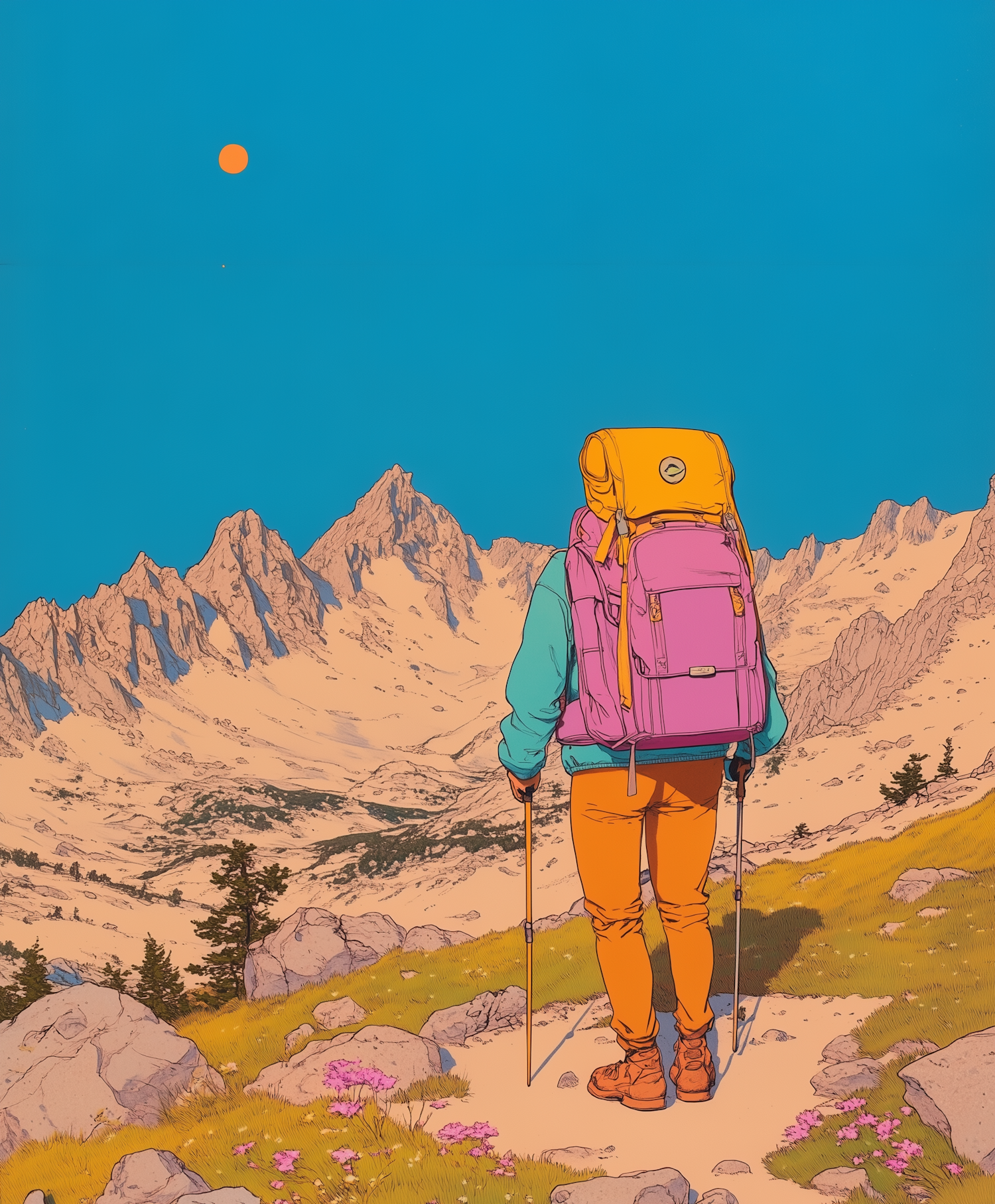 Colorful illustration of a hiker with a bright backpack on a mountain trail, surrounded by rocky peaks and a clear blue sky.