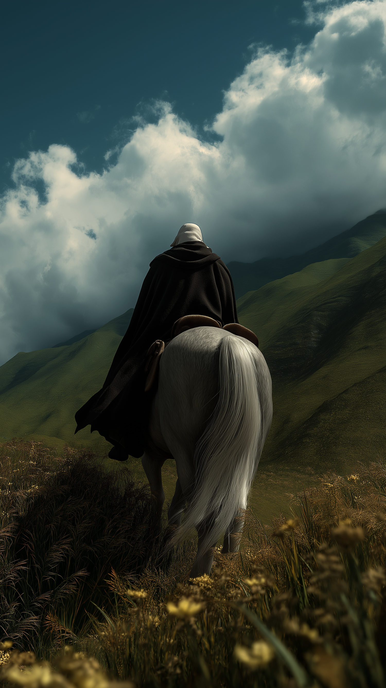 A lone rider on a white horse traverses a lush, mountainous landscape under a dramatic sky, surrounded by wildflowers and tall grass.