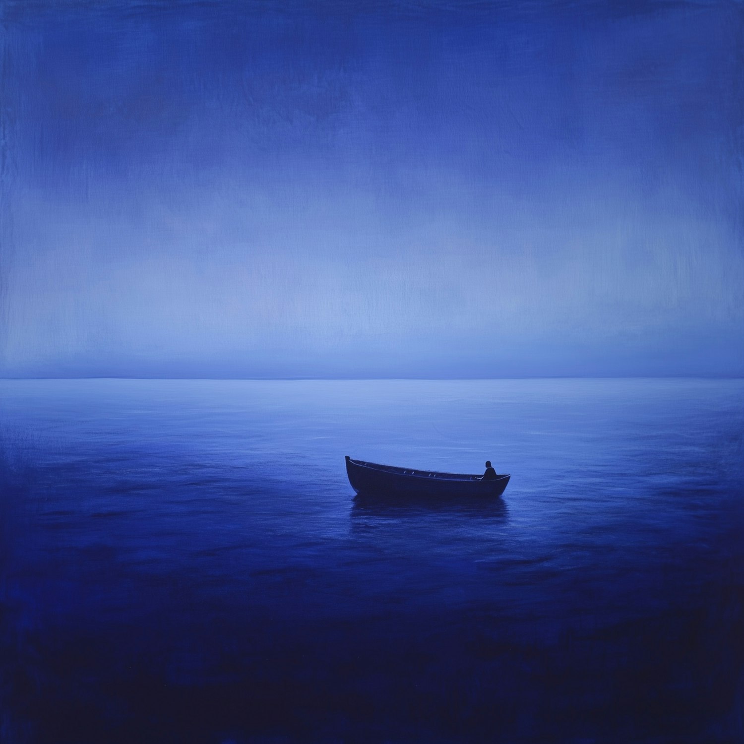 A tranquil blue-toned artwork of a lone rowboat on calm water, blending seamlessly with the sky, evoking solitude and serenity.