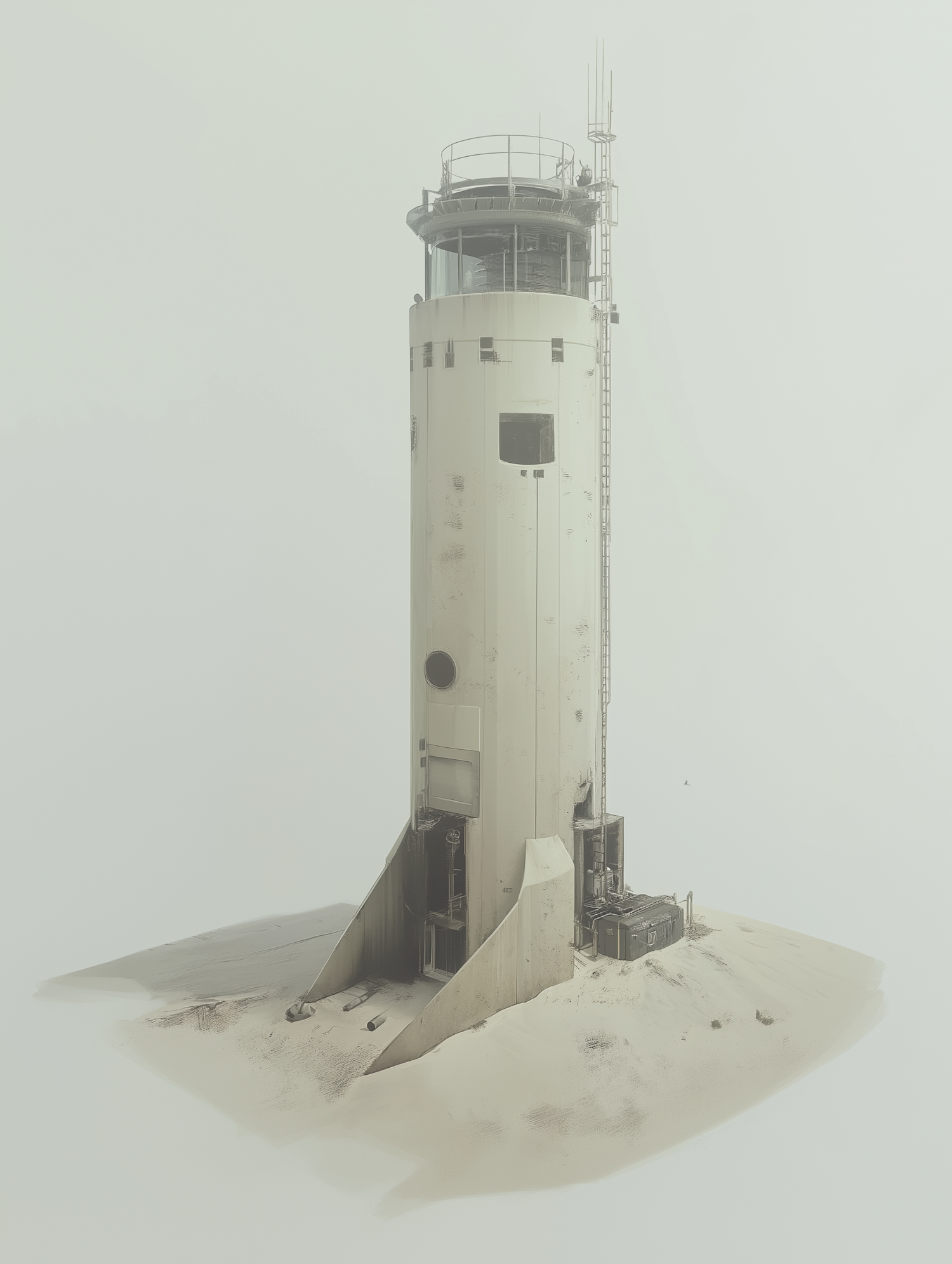 A weathered, cylindrical tower in a sandy, desolate landscape, featuring antennas and a ladder, suggesting communication or observation use.