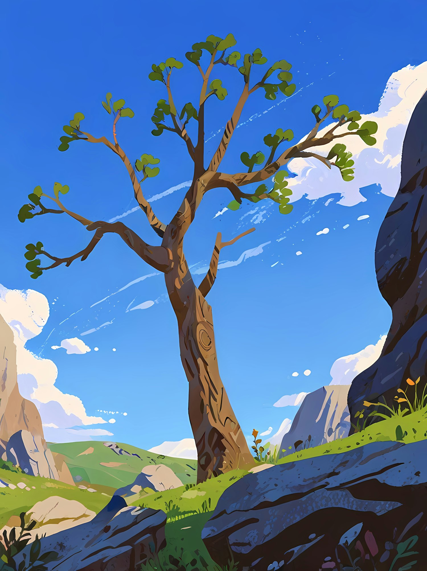A vibrant illustration of a lone tree on a grassy hill, surrounded by rocks and cliffs under a bright blue sky.