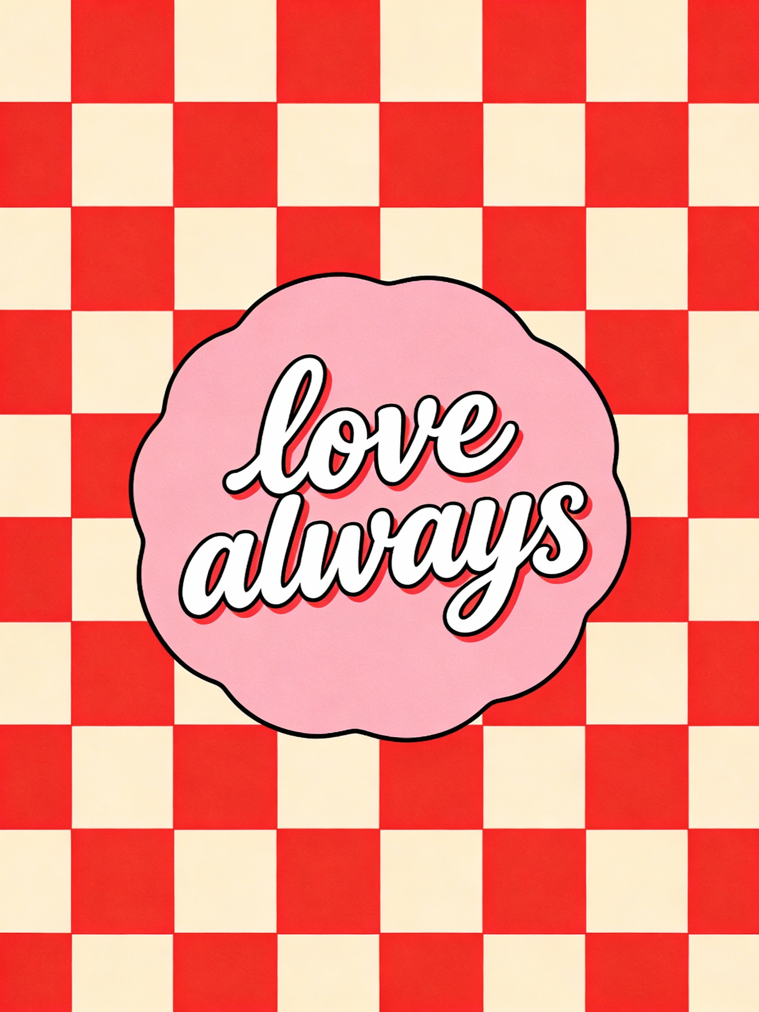 Bright red and cream checkered background with a pink centerpiece displaying 'love always' in bold cursive text.