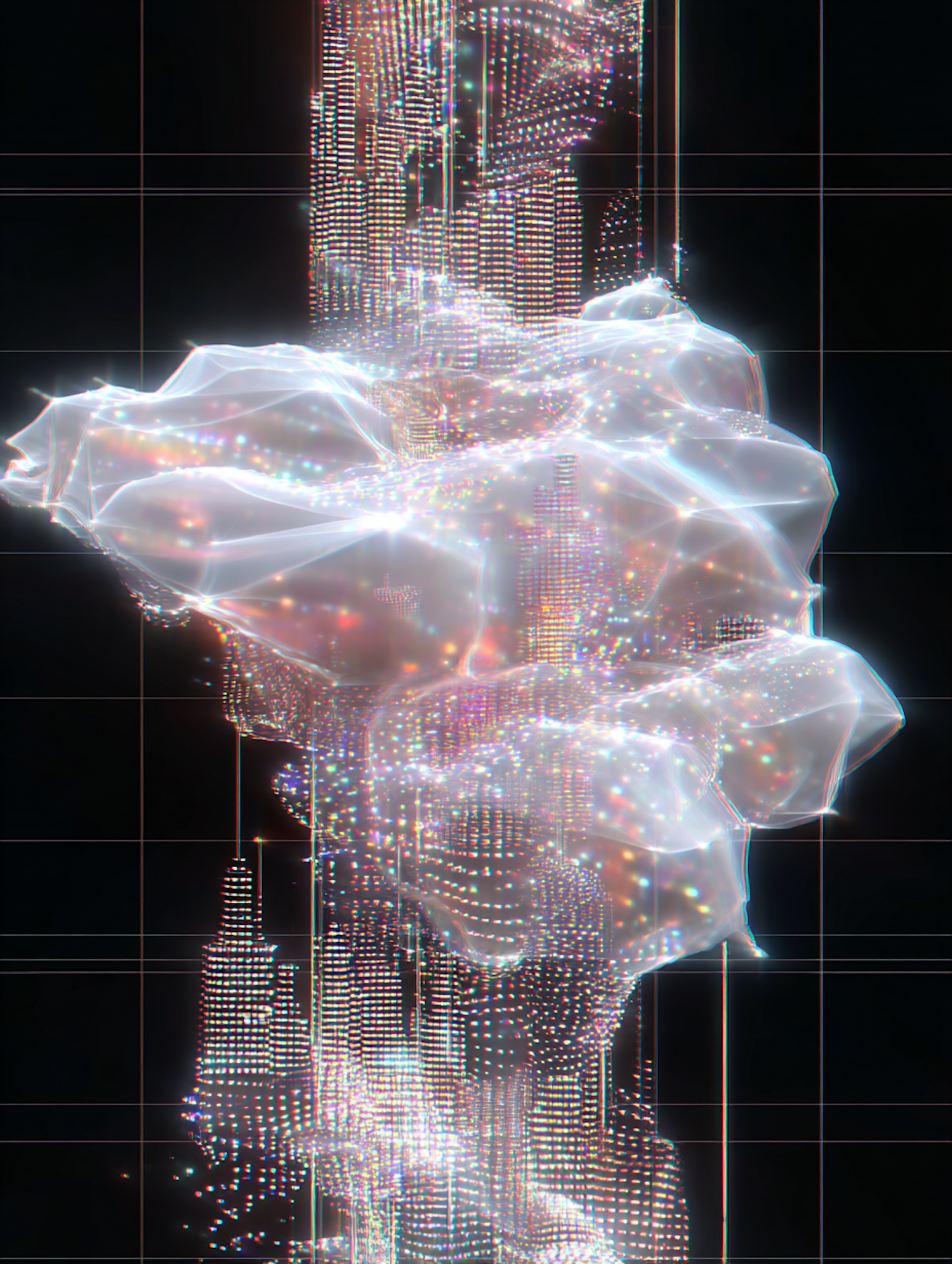 A stunning digital artwork of a glowing, abstract structure with vibrant lights and translucent forms against a dark grid background.