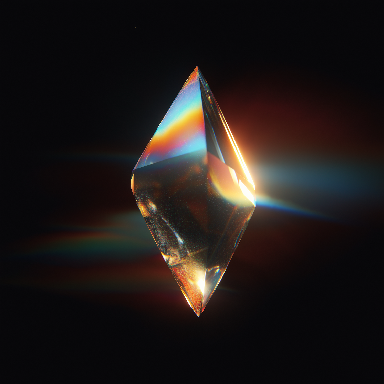 A glowing diamond-shaped crystal refracts light into vibrant colors against a dark background, creating a mystical and ethereal effect.