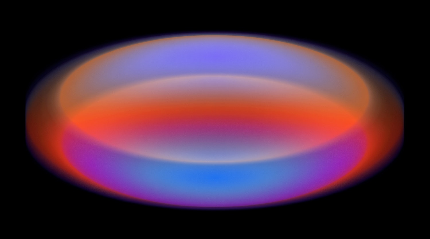 A glowing, multicolored abstract circle with gradients of blue, purple, orange, and red on a black background.