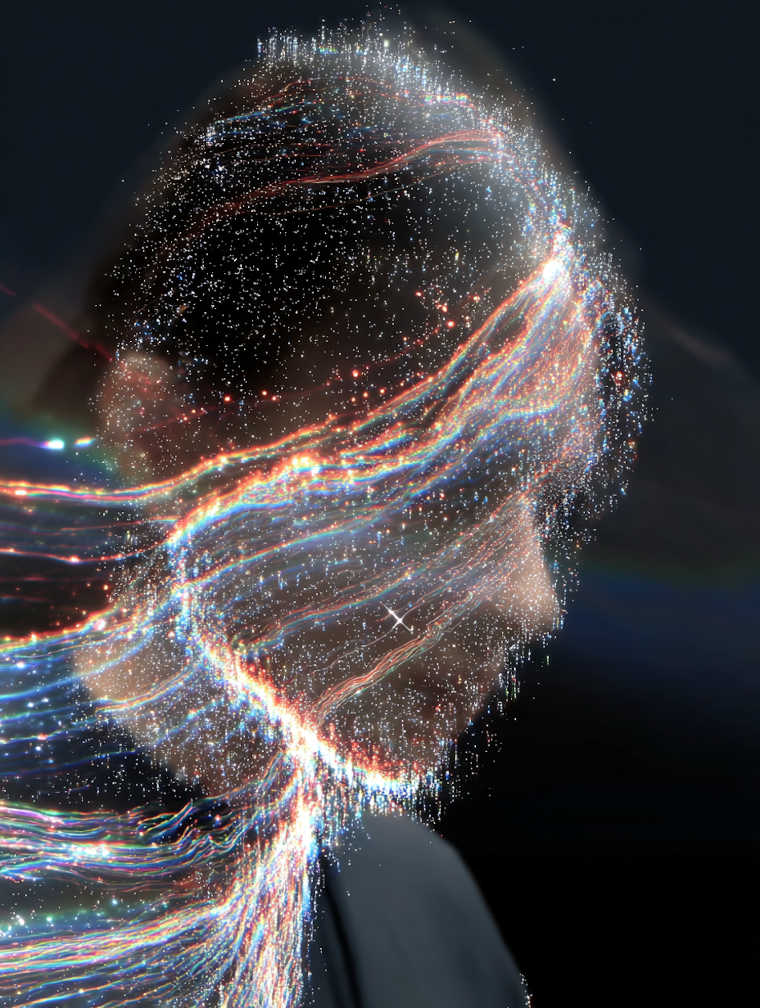 A surreal depiction of a human head with glowing, colorful particles and light streaks, creating a dynamic and abstract visual effect.