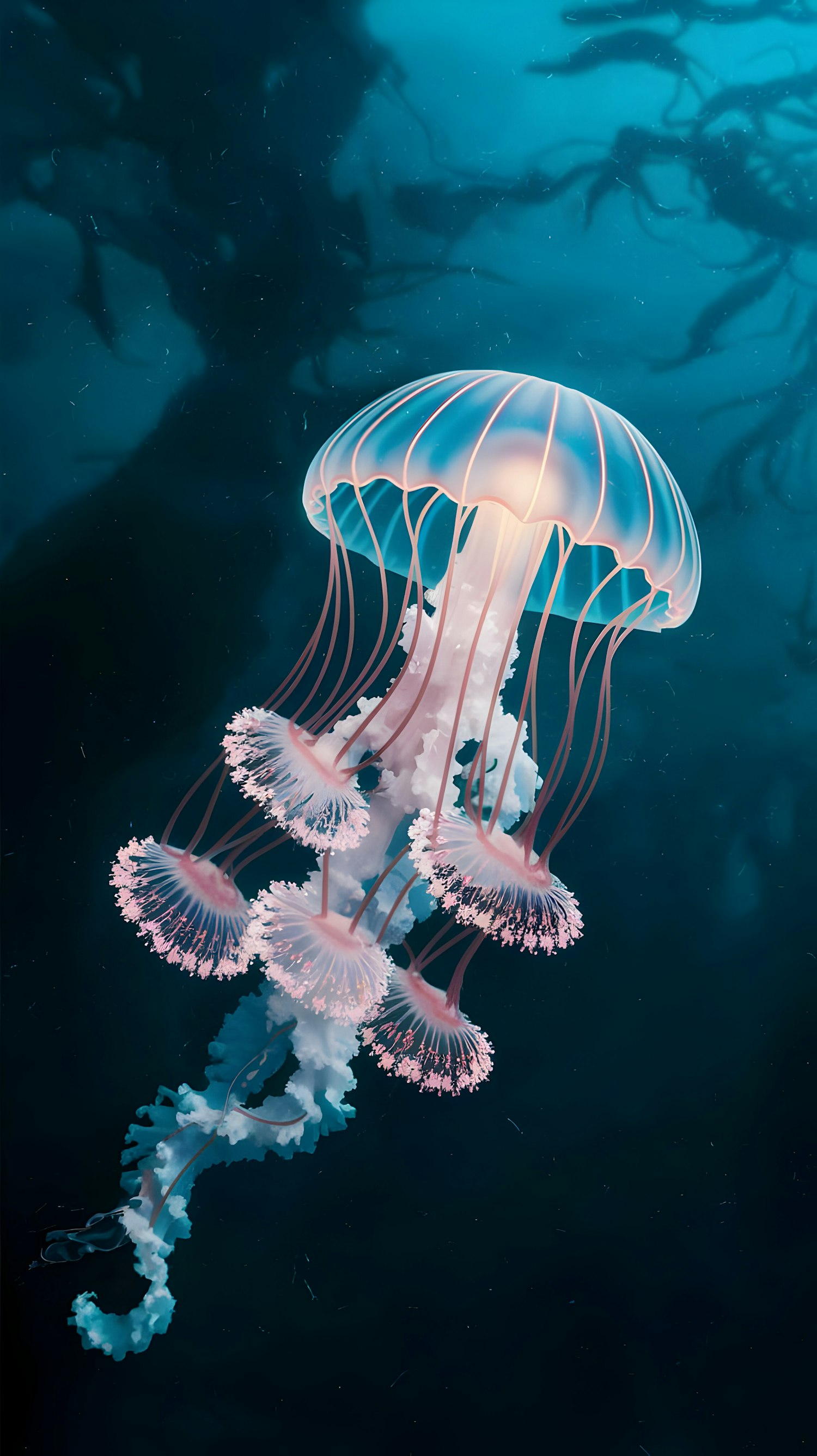 A glowing jellyfish with pink and blue hues drifts in a dark, teal ocean, surrounded by faint underwater vegetation and floating particles.