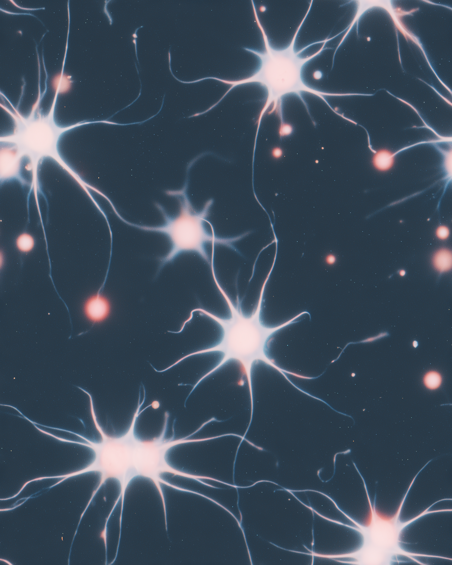 Mesmerizing neuron depiction showing their glowing interconnected structures against a dark background, symbolizing a neural network.