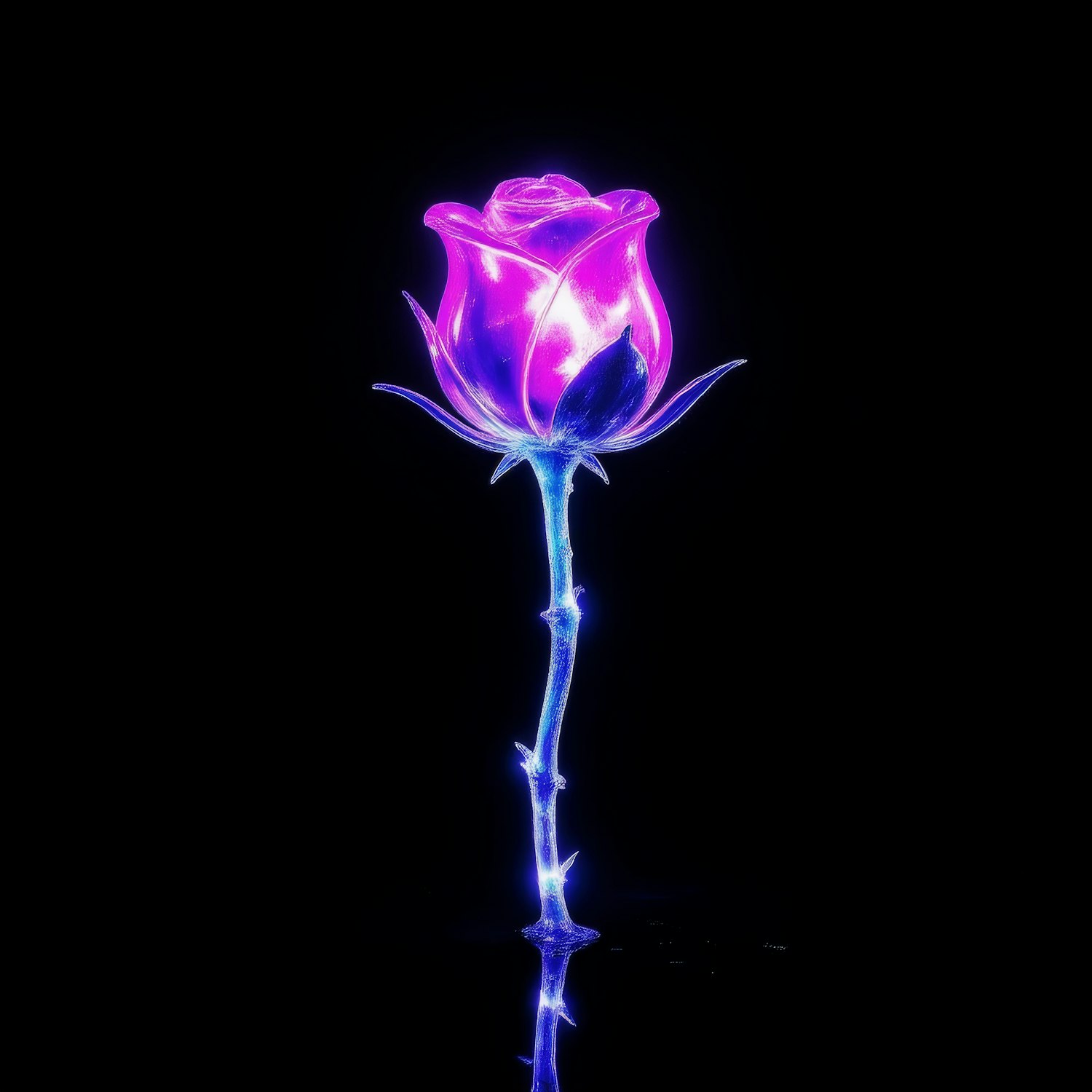 A glowing purple rose with a luminous blue stem against a black background, creating a striking and ethereal visual effect.